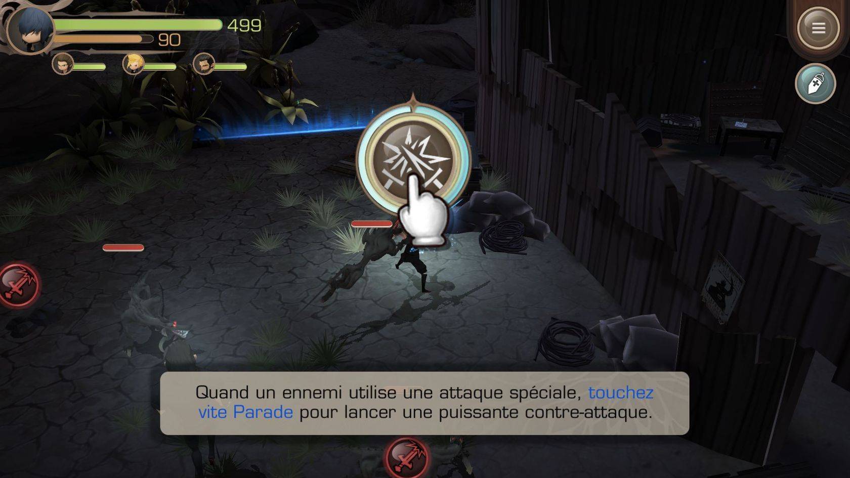 Vous débutez l'aventure en poussant la voiture. Littéralement, à vrai dire. Le joueur et la fonction tactile sont dès le départ mis à contribution pour faire avancer le véhicule. Une fois à Hammerhead, vous faites la rencontre de Cindy et de Cid, qui vont s'occuper de la réparation, en échange, bien entendu, d'une certaine somme et de quelques services rendus. L'aventure en miniature Vous contrôlez Noctis uniquement. Au début, vous n'avez guère que la possibilité de vous déplacer en touchant l'endroit où vous souhaitez vous rendre (pas de stick directionnel), avec une caméra fixe qui suit vos déplacements. En touchant une caisse, un tas de sable ou tout élément en surbrillance, vous pouvez trouver des trésors à vendre ou des consommables. Des objets brillants sont également disséminés un peu partout dans les zones. Lorsque vous voyez des monstres et allez à leur rencontre, une zone d'affrontement (assez petite) est définie autour des combattants. Ici, vous débutez avec la seule possibilité d'attaquer. Et encore, cela est automatique dès que Noctis se trouve assez proche d'un ennemi. Vous pouvez le déplacer et sélectionner une autre cible. Une fois équipé de plusieurs types d'armes (une épée à deux mains pour commencer), vous pourrez interchanger à tout moment entre ces armes durant le combat. La dernière arme utilisée est sauvegardée au moment de débuter le combat suivant (il n'est pas possible de changer d'arme sans être en combat). Vers la fin du chapitre, il est possible d'utiliser des éclipses fatales en se téléportant sur un élément du décor placé en hauteur, et ainsi prendre des ennemis par surprise. Cela ne se produit qu'une fois dans le chapitre, et on peut supposer que cet élément de gameplay ne sera pas utilisable par la suite en toute liberté. C'est à peu près tout pour les fonctionnalités disponibles à ce moment du jeu. On peut noter la fluidité entre les passages d'exploration et de combat, ainsi que la difficulté qui n'est pas très élevée. Il peut néanmoins y avoir quelques ralentissements ou freezes de l'image par moment (dépendant sûrement de l'appareil utilisé), mais le plus gros problème rencontré concerne l'assaut éclipse. Parfois, il y a des obstacles dans la zone de combat, et il se trouve que les assauts éclipse ne permettent pas de les traverser (comme c'est notamment le cas dans le jeu d'origine). Du coup, on cherche parfois à utiliser sa compétence sur un ennemi mais on se retrouve coincé par un obstacle que l'on doit finalement contourner à la main. Voyage, voyage... Pour en revenir à l'exploration, cela reste assez limité, en dehors des objets brillants à trouver et des ennemis à affronter, il n'y a pas grand-chose à visiter. L'histoire est beaucoup plus linéaire que dans le jeu d'origine (il y a beaucoup moins d'annexe), le contenu est allégé de manière générale, mais les zones, qui font office de donjon, ne donnent pas une grande liberté. Il y a quelques embranchements, mais menant généralement à des impasses et donnant la possibilité d'acquérir un nouveau trésor, ou de débloquer l'accès au chemin suivant. Vous tomberez peut-être sur un objet alimentaire qui permettra à Ignis d'imaginer une nouvelle recette. Une quête se lancera alors, pour laquelle vous devrez trouver le second aliment requis. Le scénario est défini par la quête en cours (indiquée par une flèche bleue sous le personnage), et terminer une quête principale vous permet de passer dans une nouvelle zone. Après avoir terminé la première partie de la quête principale à Hammerhead, vous pouvez reprendre la route à bord de la Regalia (votre voiture) vers le sud, en direction de la baie de Galdina. Vous rencontrerez en chemin une ou deux quêtes annexes, l'une vous demandant d'aller récupérer un objet dans la zone, et une autre qui vous fera découvrir un nouveau système de chasse aux trésors. Vous trouverez le premier indice d'une carte au trésor qui vous indiquera où trouver le second indice, et ainsi de suite jusqu'à déterrer un trésor. Entre chaque étape de votre voyage, vous profiterez de la route comme un passager, et pourrez écouter les conversations entre les compagnons, admirer le paysage, ou encore essayer de piloter en déviant un peu de la trajectoire (sans pouvoir sortir de la route). Il s'agit bien entendu d'un élément tiré tout droit du jeu d'origine, mais qui a été largement allégé lui aussi. Non seulement la phase de déplacement est assez courte, mais on peut en plus la passer. Il y a aussi quelques temps de chargement, notamment au moment de changer de quête principale, qui peuvent être assez longuets, mais certainement rien de comparable à ce qu'on a pu connaître sur console. L'expérience de combat et de quêtes qui est gagnée est cumulée, et distribuée à chaque fois que la quête principale progresse. Des Points de Compétence (PC) sont gagnés à chaque prise de niveau. Des menus dans le plus simple appareil Le menu vous permet tout d'abord de voir la carte de la zone, qui indique également les marchands et les zones de combat. Vous avez ensuite accès aux équipements des personnages. Noctis peut s'équiper de trois types d'armes différents (une épée à une main par défaut) et d'un accessoire, tandis que ses compagnons peuvent chacun équiper une arme (définie) et un accessoire. Vous pouvez acquérir de nouveaux équipements au cours des quêtes ou de l'exploration ou encore aux marchands. Vous avez ensuite le menu des compétences. Il s'agit d'un arbre de compétences permettant de consommer les PC obtenus en prenant des niveaux. D'un côté, vous pouvez améliorer les compétences de Noctis (par type d'arme, pour la résistance, ajouter des combos d'attaque, etc.) mais vous pouvez aussi dépenser vos points dans la seconde branche qui octroie par exemple de nouvelles compétences à vos alliés, ou leur permet d'utiliser la magie. Il sem