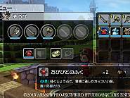 ■ Équipement Les matériaux que vous créez au cours de votre aventure vous permettront de réaliser diverses recettes et de produire des objets variés au bénéfice de la renaissance du monde. Vous pourrez également créer des équipements familiers de la série Dragon Quest pour votre personnage, ce qui inclut des armes, armures, boucliers et autres équipements. Vous pourrez vous équiper de cinq éléments à la fois qui seront visibles sur votre personnage.