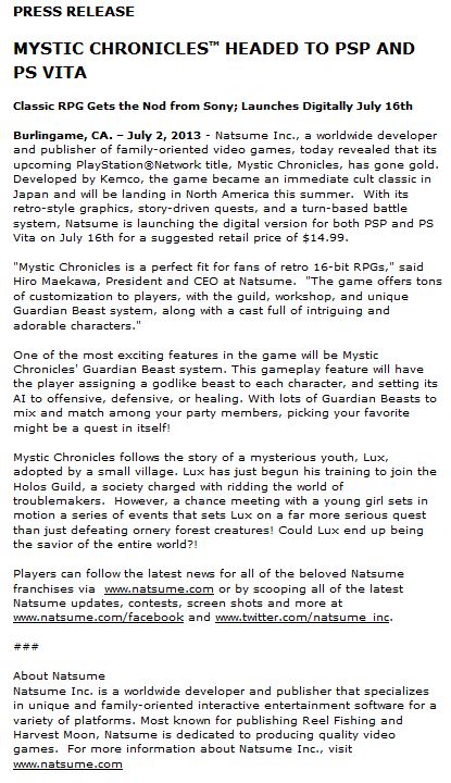 Natsume a annoncé que Mystic Chronicles, le RPG rétro de Kemco, sortira le 16 juillet prochain en Amérique du Nord.