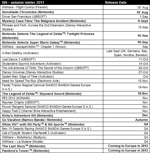 C'est par l'intermédiaire du planning des sorties européennes diffusé par Nintendo lors de la Gamescom que nous apprenons aujourd'hui que Pandora's Tower sortira bien sur Wii au cours de l'année 2012.