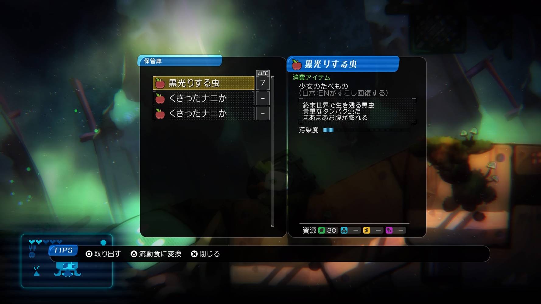 Par ailleurs, une fois l'exploration terminée, les objets d’objectif de la mission sont conservés en tant que « ressources spéciales », tandis que les autres objets ramassés sont convertis en quatre types de « ressources ». Les ressources spéciales sont les ingrédients pour créer des meubles ou des médicaments. Les ressources organiques se composent de divers éléments tels que des articles de réparation et des potions. Les ressources inorganiques consistent en un assortiment d'objets tels que des bombes, ainsi que des objets de type offensif et défensif. Les ressources énergétiques sont constituées de nombreux articles comme des gadget et des batteries. Enfin, les ressources contaminées sont des éléments qui sont progressivement contaminés. En utilisant ces ressources, le robot assistant peut créer les éléments nécessaires pour prendre soin de Toriko.
