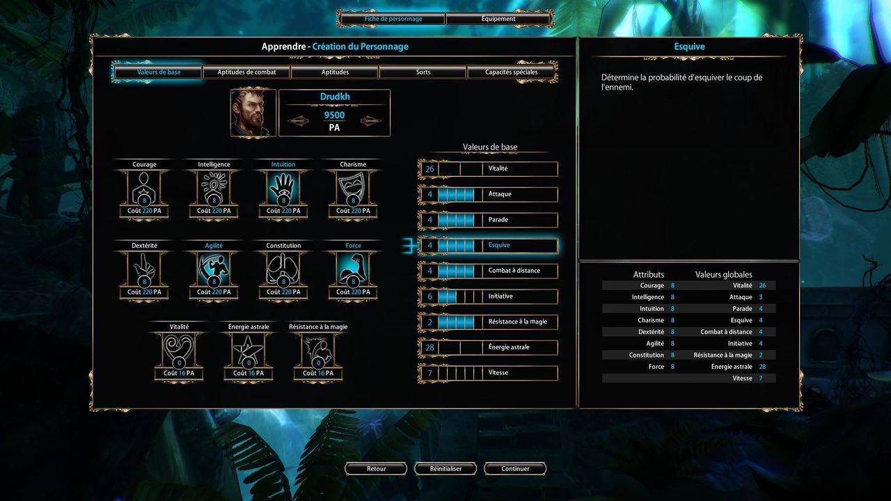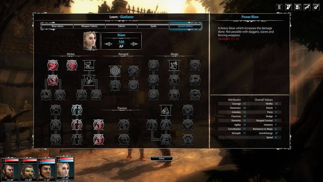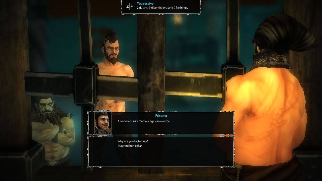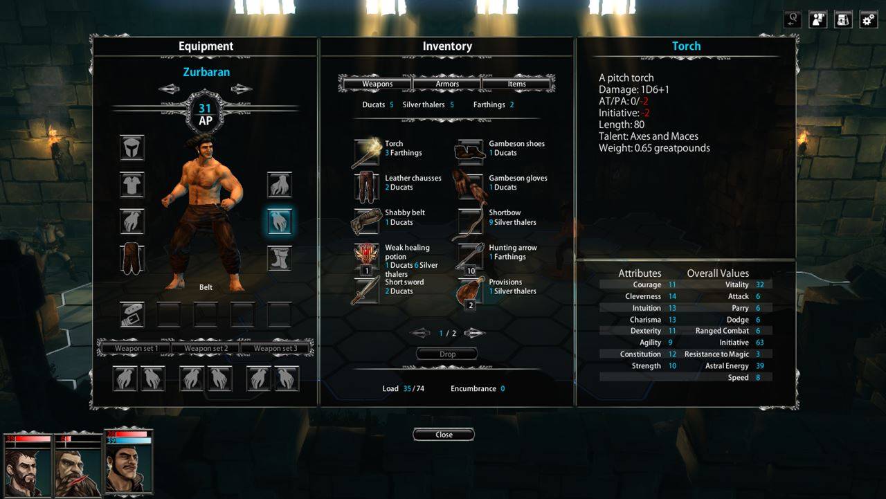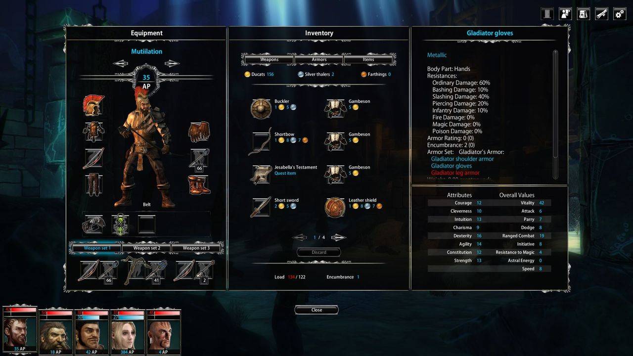 Blackguards, c'est avant tout l'Œil Noir, jeu de rôle allemand dont la première édition remonte à 1984. Bien que très semblable à ses homologues médiévaux fantastiques au premier abord (comme Donjons & Dragons), l'univers du jeu se veut plus réaliste et plus approfondi, notamment dans la description des mœurs, des religions et des sociétés qui composent ce monde. Il privilégie aussi le réalisme des actions plutôt que l'héroïsme, ce qui est très intéressant pour un jeu de table mais qui, dans le cas d'un jeu vidéo, peut rapidement devenir une plaie dans le pied (pour rester poli). Un livre interactif Le jeu débute par une mystérieuse vidéo dont on ne comprend pas grand chose, puis la découverte du cadavre de votre amie, une certaine princesse dont vous aviez la garde, et puis un combat. Cette première bataille a pour but de vous familiariser rapidement avec le système tactique au tour par tour du jeu. Bien que ce combat ne soit pas difficile, il se termine en drame, par une accusation de meurtre (dont vous n'êtes pas trop certain d'y être impliqué ou non) qui vous envoie directement en prison. C'est un peu brutal comme introduction, mais cela donne tout de suite un aperçu de l'univers impitoyable que vous allez être amenés à explorer... Vous voilà donc au fin fond d'un cachot humide, attendant votre exécution. Mais heureusement, un nain - au passé un peu louche - qui passait par là vous porte secours. Voilà votre premier compagnon d'aventure. Très vite, un magicien aux vilaines tendances de Don Juan se joindra à vous, lui aussi enfermé pour des raisons obscures (mais pas forcément injustifiées...). Et plus tard, ce sera au tour d'une elfe droguée (mais heureusement elle sait aussi manier un arc) et d'une sorte de guerrier maori de compléter vos rangs. En dehors de votre propre personnage, vous n'aurez donc aucune liberté pour constituer votre équipe. Justement, venons-en au déroulement de l'aventure. Autant le dire tout de suite : il est purement et simplement linéaire. Il n'y a aucun concept d'exploration ou de liberté. Vous devrez vous contenter de suivre les scènes les unes après les autres, à l'exception près de quelques quêtes secondaires qui consisteront généralement en un ou plusieurs combats en parallèle de l'aventure principale. Les déplacements sur la carte du monde se résument à cliquer sur les lieux accessibles pour s'y rendre. Le rythme n'est pas terrible, dans le sens où la mise en scène est plate et ne dégage (généralement) pas beaucoup d'émotion. Néanmoins, il faut plutôt aborder le jeu comme un livre, dont on tourne les pages peu à peu pour en découvrir la profondeur, et qui nous laisse parfois interagir par l'intermédiaire de combats ou de dialogues à choix multiples. En résumé : Une évolution des personnages riche mais complexe Comme déjà évoqué précédemment, vous ne pourrez réellement créer qu'un seul personnage de votre équipe. En revanche, une fois votre groupe formé, vous pourrez faire évoluer chaque combattant comme vous le souhaitez. Commençons par la création de votre avatar. Au niveau physique, le choix sera assez limité, mais suffisant pour fournir un personnage à votre goût. C'est plutôt au niveau des aptitudes que cela devient intéressant. Le système est assez complexe, et propose pour les néophytes une répartition automatique des points de compétences. Si vous n'êtes pas habitué aux règles de l'Œil Noir, cette option est sans doute la plus prudente. Car un personnage raté peut se révéler totalement inefficace en combat, et vous amener à un abandon précoce du jeu... Pour les autres, le mode "expert" vous donne le contrôle total de la répartition des points. - Attributs : il y a 8 attributs en tout (Courage, Intelligence, Intuition, Charisme, Dextérité, Agilité, Constitution et Force), influençant chacun une ou plusieurs statistiques de base du héros (sa vitalité, sa capacité à se battre, sa résistance à la magie...). De même, les Attributs auront un impact sur les capacités de combat ou les sorts. Il est également possible d'augmenter directement 3 statistiques principales : Vitalité, Énergie Astrale (l'équivalent des MP), et Résistance à la Magie. - Maniement des armes : chaque type d'arme doit être appris pour avoir une chance d'être manié. Il y a 11 catégories, allant de la dague à l'arc, en passant par l'épée, la hache, l’arbalète et une multitude d'autres. Votre niveau de maniement influencera surtout le taux de réussite des attaques, les dégâts étant eux définis par l'arme utilisée (et parfois aussi par vos Attributs de base). Une caractéristique du jeu est aussi de devoir définir, pour chaque type d'arme, un balancement entre Parade ou Attaque. Ainsi, pour un niveau 10 dans une arme, vous pouvez choisir d'équilibrer son efficacité entre parade et attaque (5/5), ou au contraire de privilégier l'attaque (2/8 par exemple), et inversement. Cet aspect vous permettra de peaufiner vos tactiques de combat, et il peut être changé n'importe quand à travers le menu principal, sans consommer de PA. - Compétences spéciales : elles confèrent divers avantages directs ou indirects pour le combat, les sorts... Au départ, vous pouvez choisir n'importe lesquelles, moyennant des PA bien entendu, et à condition d'avoir le niveau nécessaire dans certains Attributs. Plus tard dans le jeu, il vous faudra trouver des Instructeurs pour débloquer de nouvelles compétences spéciales. - Aptitudes : ces 9 capacités viennent enrichir les possibilités de gameplay, en conférant à chaque personnage certaines capacités, comme le Soin des blessures, la Détection des pièges, ou la Connaissance de la Faune. Ces aptitudes évoluent par palier. Le premier palier correspond au niveau 0 (c'est-à-dire lorsque vous activez la compétence), et les paliers suivants sont aux niveaux 8, 13 et 18. Lorsqu'une aptitude est activée pour 