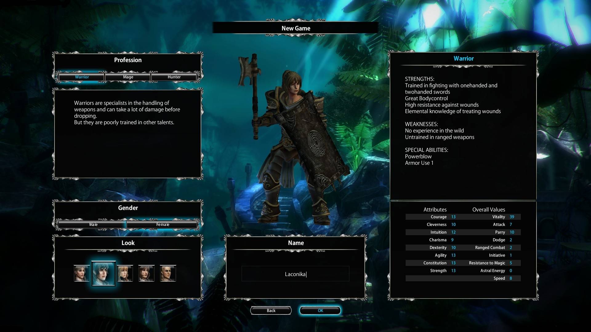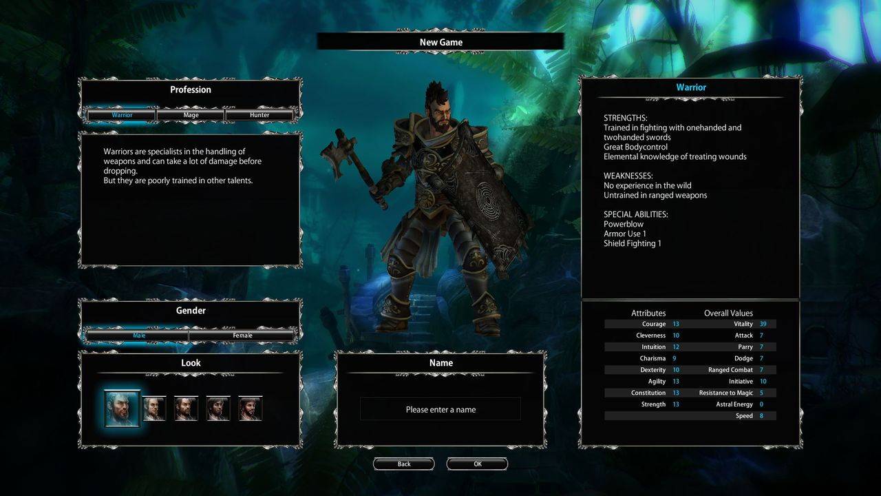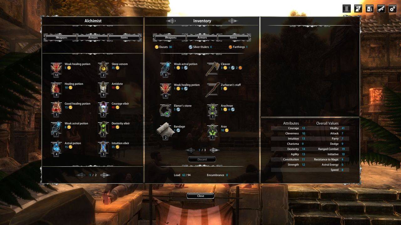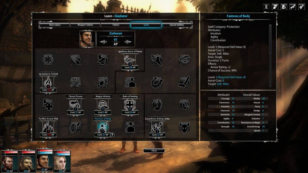 Blackguards, c'est avant tout l'Œil Noir, jeu de rôle allemand dont la première édition remonte à 1984. Bien que très semblable à ses homologues médiévaux fantastiques au premier abord (comme Donjons & Dragons), l'univers du jeu se veut plus réaliste et plus approfondi, notamment dans la description des mœurs, des religions et des sociétés qui composent ce monde. Il privilégie aussi le réalisme des actions plutôt que l'héroïsme, ce qui est très intéressant pour un jeu de table mais qui, dans le cas d'un jeu vidéo, peut rapidement devenir une plaie dans le pied (pour rester poli). Un livre interactif Le jeu débute par une mystérieuse vidéo dont on ne comprend pas grand chose, puis la découverte du cadavre de votre amie, une certaine princesse dont vous aviez la garde, et puis un combat. Cette première bataille a pour but de vous familiariser rapidement avec le système tactique au tour par tour du jeu. Bien que ce combat ne soit pas difficile, il se termine en drame, par une accusation de meurtre (dont vous n'êtes pas trop certain d'y être impliqué ou non) qui vous envoie directement en prison. C'est un peu brutal comme introduction, mais cela donne tout de suite un aperçu de l'univers impitoyable que vous allez être amenés à explorer... Vous voilà donc au fin fond d'un cachot humide, attendant votre exécution. Mais heureusement, un nain - au passé un peu louche - qui passait par là vous porte secours. Voilà votre premier compagnon d'aventure. Très vite, un magicien aux vilaines tendances de Don Juan se joindra à vous, lui aussi enfermé pour des raisons obscures (mais pas forcément injustifiées...). Et plus tard, ce sera au tour d'une elfe droguée (mais heureusement elle sait aussi manier un arc) et d'une sorte de guerrier maori de compléter vos rangs. En dehors de votre propre personnage, vous n'aurez donc aucune liberté pour constituer votre équipe. Justement, venons-en au déroulement de l'aventure. Autant le dire tout de suite : il est purement et simplement linéaire. Il n'y a aucun concept d'exploration ou de liberté. Vous devrez vous contenter de suivre les scènes les unes après les autres, à l'exception près de quelques quêtes secondaires qui consisteront généralement en un ou plusieurs combats en parallèle de l'aventure principale. Les déplacements sur la carte du monde se résument à cliquer sur les lieux accessibles pour s'y rendre. Le rythme n'est pas terrible, dans le sens où la mise en scène est plate et ne dégage (généralement) pas beaucoup d'émotion. Néanmoins, il faut plutôt aborder le jeu comme un livre, dont on tourne les pages peu à peu pour en découvrir la profondeur, et qui nous laisse parfois interagir par l'intermédiaire de combats ou de dialogues à choix multiples. En résumé : Une évolution des personnages riche mais complexe Comme déjà évoqué précédemment, vous ne pourrez réellement créer qu'un seul personnage de votre équipe. En revanche, une fois votre groupe formé, vous pourrez faire évoluer chaque combattant comme vous le souhaitez. Commençons par la création de votre avatar. Au niveau physique, le choix sera assez limité, mais suffisant pour fournir un personnage à votre goût. C'est plutôt au niveau des aptitudes que cela devient intéressant. Le système est assez complexe, et propose pour les néophytes une répartition automatique des points de compétences. Si vous n'êtes pas habitué aux règles de l'Œil Noir, cette option est sans doute la plus prudente. Car un personnage raté peut se révéler totalement inefficace en combat, et vous amener à un abandon précoce du jeu... Pour les autres, le mode "expert" vous donne le contrôle total de la répartition des points. - Attributs : il y a 8 attributs en tout (Courage, Intelligence, Intuition, Charisme, Dextérité, Agilité, Constitution et Force), influençant chacun une ou plusieurs statistiques de base du héros (sa vitalité, sa capacité à se battre, sa résistance à la magie...). De même, les Attributs auront un impact sur les capacités de combat ou les sorts. Il est également possible d'augmenter directement 3 statistiques principales : Vitalité, Énergie Astrale (l'équivalent des MP), et Résistance à la Magie. - Maniement des armes : chaque type d'arme doit être appris pour avoir une chance d'être manié. Il y a 11 catégories, allant de la dague à l'arc, en passant par l'épée, la hache, l’arbalète et une multitude d'autres. Votre niveau de maniement influencera surtout le taux de réussite des attaques, les dégâts étant eux définis par l'arme utilisée (et parfois aussi par vos Attributs de base). Une caractéristique du jeu est aussi de devoir définir, pour chaque type d'arme, un balancement entre Parade ou Attaque. Ainsi, pour un niveau 10 dans une arme, vous pouvez choisir d'équilibrer son efficacité entre parade et attaque (5/5), ou au contraire de privilégier l'attaque (2/8 par exemple), et inversement. Cet aspect vous permettra de peaufiner vos tactiques de combat, et il peut être changé n'importe quand à travers le menu principal, sans consommer de PA. - Compétences spéciales : elles confèrent divers avantages directs ou indirects pour le combat, les sorts... Au départ, vous pouvez choisir n'importe lesquelles, moyennant des PA bien entendu, et à condition d'avoir le niveau nécessaire dans certains Attributs. Plus tard dans le jeu, il vous faudra trouver des Instructeurs pour débloquer de nouvelles compétences spéciales. - Aptitudes : ces 9 capacités viennent enrichir les possibilités de gameplay, en conférant à chaque personnage certaines capacités, comme le Soin des blessures, la Détection des pièges, ou la Connaissance de la Faune. Ces aptitudes évoluent par palier. Le premier palier correspond au niveau 0 (c'est-à-dire lorsque vous activez la compétence), et les paliers suivants sont aux niveaux 8, 13 et 18. Lorsqu'une aptitude est activée pour 