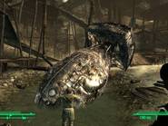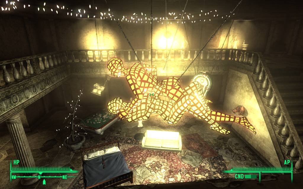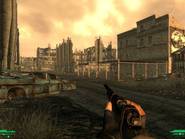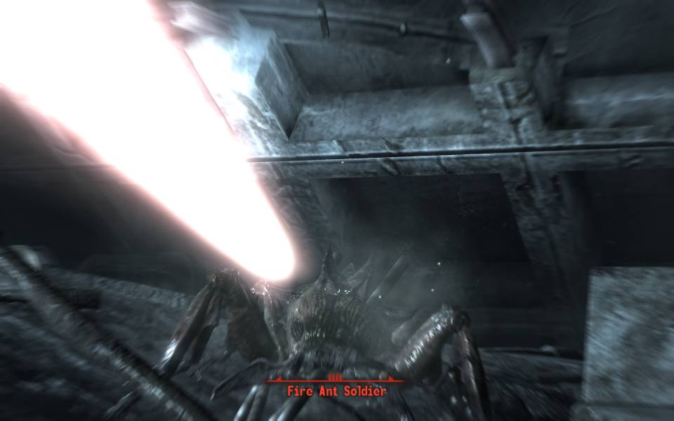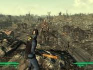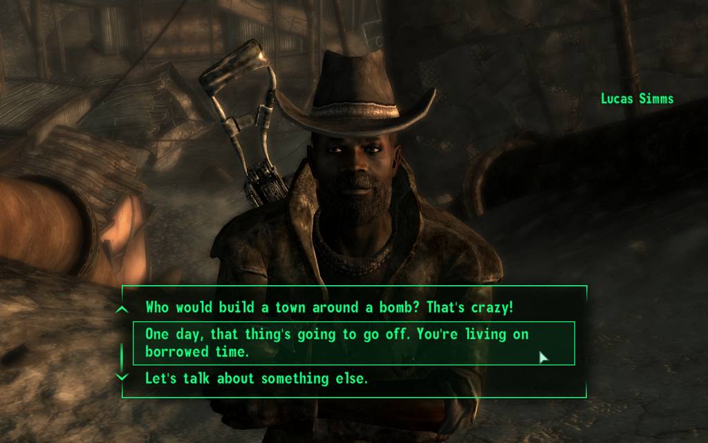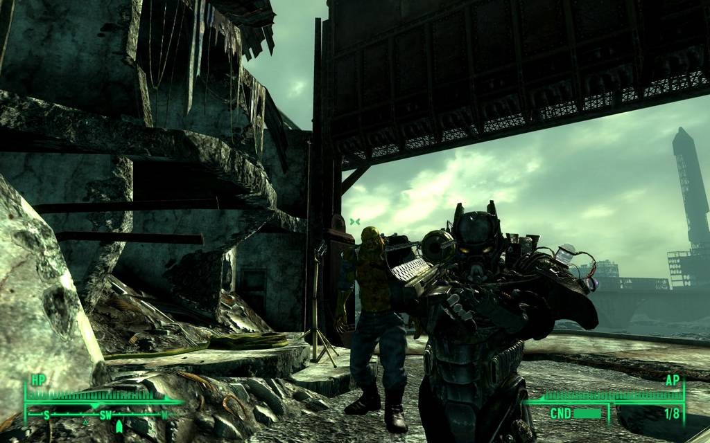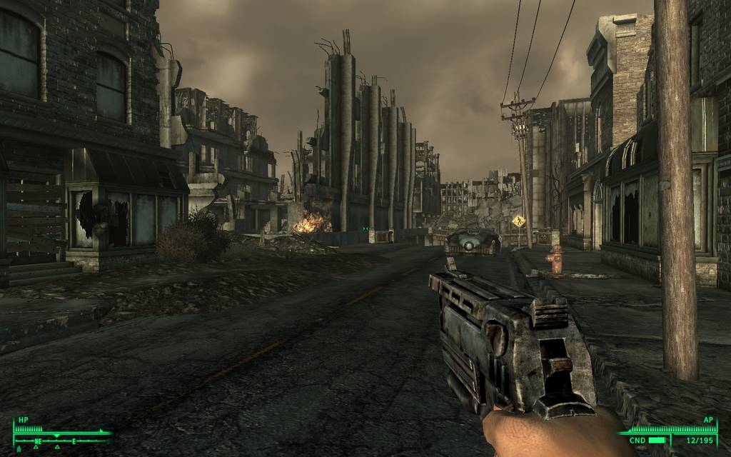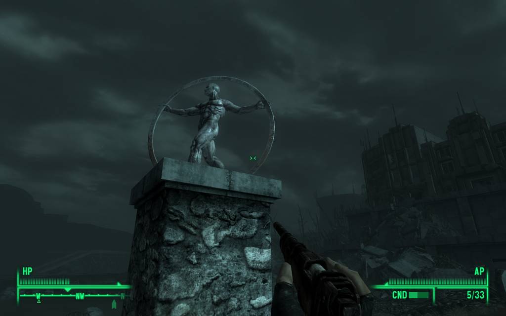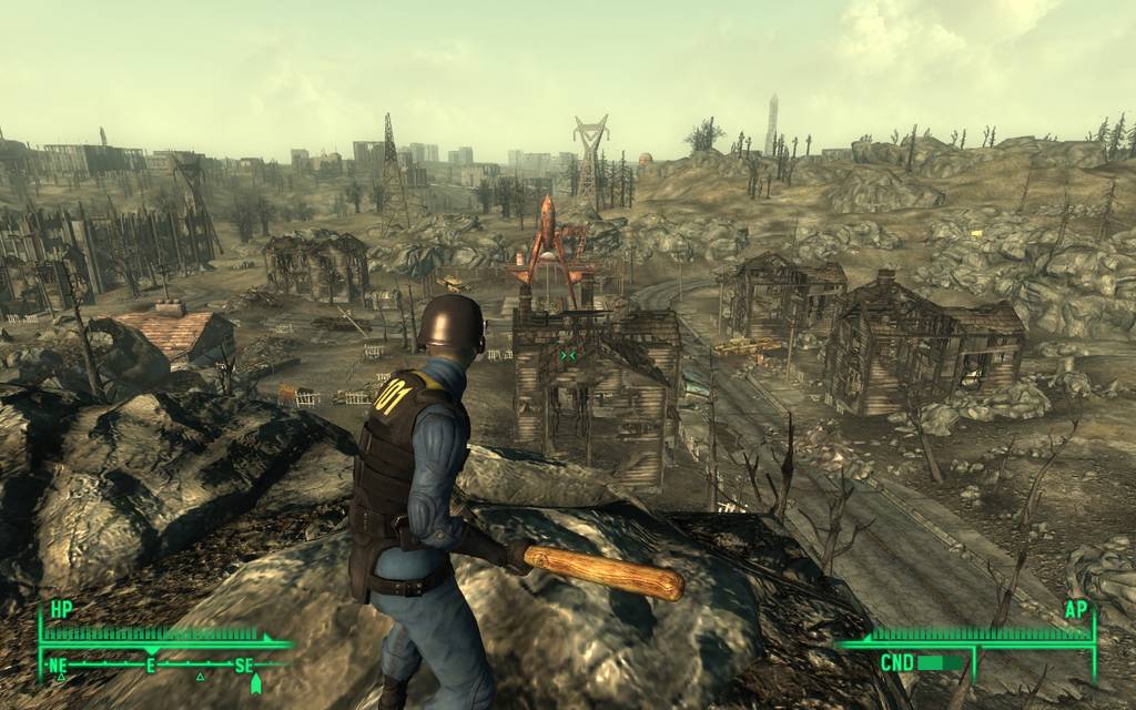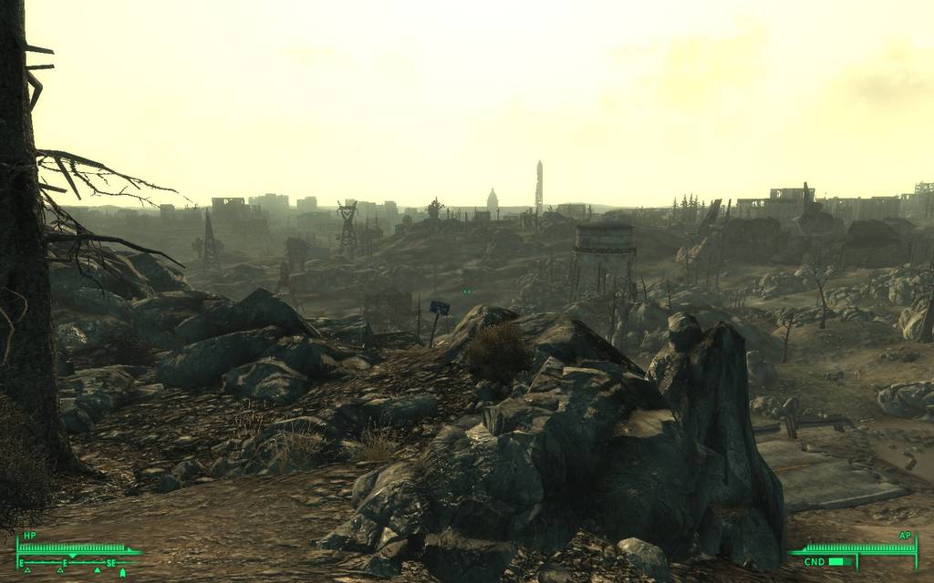 Fallout 3 fait donc partie de ces jeux qui parlent à ceux qui ont une âme d’explorateur. Et à ce niveau-là, il est pleinement réussi même si l’idée de voyager dans des plaines calcinées n’a, à priori, rien de plaisant. Pourtant, pris entre un jeu de lumière superbement géré, qui nous indique l’évolution des heures, et un champ de vision très large permettant de distinguer à des kilomètres de vieilles tours abandonnées ou autres bâtisses, on peut finir aisément par se plaire dans cette exploration grandiose et contemplative. Seules les limites imposées par le jeu viennent rappeler que le monde entier n’est pas à notre disposition. Il est d’ailleurs dommage que tout ne soit pas plus vaste, d’autres jeux du même acabit ayant proposé plus de zones à explorer sur des machines de générations précédentes. On peut également regretter que les villages extérieurs, à quelques exceptions près qui se comptent sur les doigts d’une main, ne regroupent même pas une dizaine de personnes. Le terme Terres Désolées prenant alors tout son sens.
