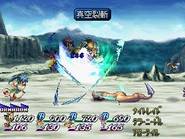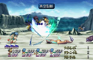 Au niveau des combats, nous avons droit à un Tales Of (ben tiens, je vous en apprend une bonne là hein ?!). Scrolling horizontal donc qui impose un décor de fond en 2D pour la plupart d’un très bon rendu, avec un terrain en 3D qui permet de multiples zooms lors des phases dites de « bourrinage intensif ». Rien à dire de ce côté-là non plus, surtout que les effets de lumière et autre effets sont vraiment de très bonne facture et on ne cesse d’en prendre pleins les mirettes.