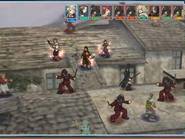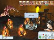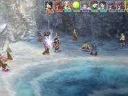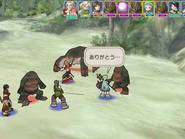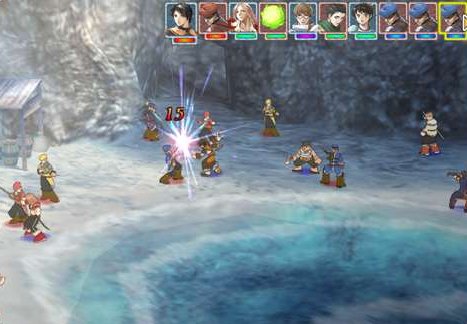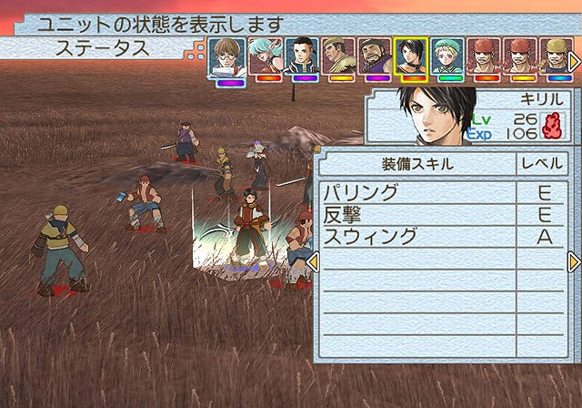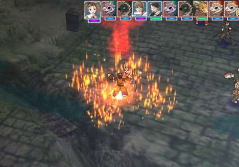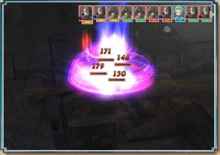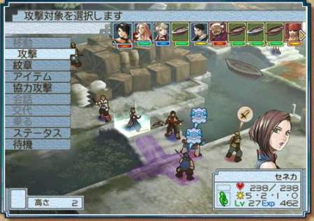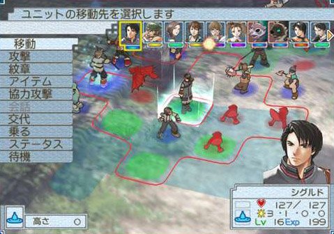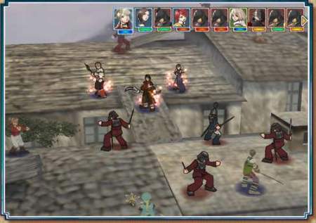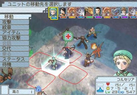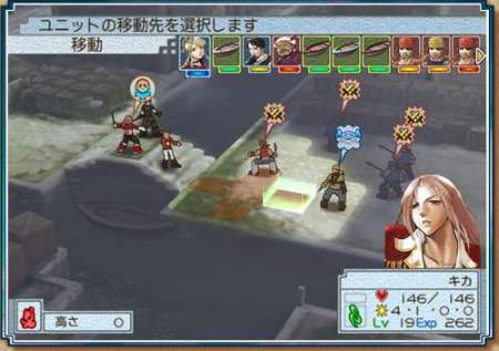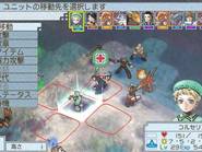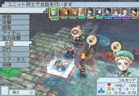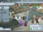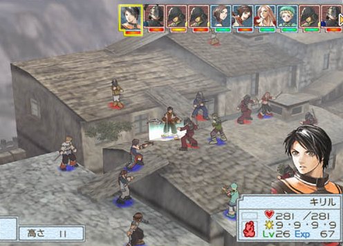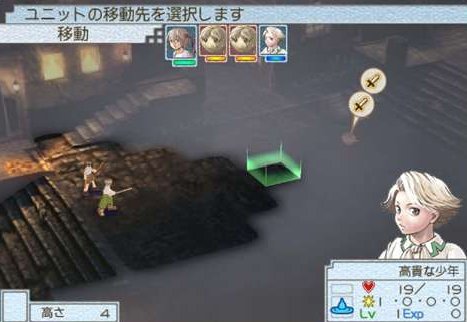 Un épisode s’insérant dans la continuité du 4. Cet épisode commence quelques années avant les événements liés à Suikoden 4. Il faut savoir que la saga des Suikoden prend pied dans un univers qui lui est propre et que chaque épisode est lié aux autres par une chronologie historique sans cesse renouvelée mais qui s’appuie aussi sur des acquis. Cet épisode commence donc 3 ans avant la guerre pour la libération des Îles et on se retrouve à combattre avec Snowe et le héros de Suikoden 4 enfants. Cette première bataille simpliste nous permet d’en apprendre plus sur le système de combat. Peu après, apparaît un groupe de combattants qui vient leur prêter main forte. Ce groupe est dirigé par un dénommé Walter, une personne originaire de l’Empire de la Lune Ecarlate. Ce dernier enquête sur les Canons à Rune qui se sont développés au sein de ce pays. Sa quête va l’amener à rencontrer de nombreuses figures de Suikoden 4. L’histoire fournira de nombreux éléments liés au background de ce dernier puis évoluera vers un scénario très différent. Après quelques batailles d'introductions, l'histoire reprend pied quelques années après l'épisode 4. On retrouve ainsi Kyril, le fils de Walter, qui enquête lui aussi sur les canons à rune et découvre qu’un mystérieuse force tente de mettre la main sur les derniers modèles existant. La Guerre pour la Libération des Îles ayant mis d’une certaine manière fin à la production de cet engin de mort. Cet épisode suit directement l’épisode 4 mais introduit une nouvelle intrigue. Néanmoins, celle-ci est liée de manière profonde avec le précédent épisode car elle aborde un thème entrevu dans ce dernier. On découvre d’une certaine manière que le scénario de Suikoden 4 était doté de certaines subtilités qui avaient pu nous paraître anodines tandis que d’autres prennent enfin un sens. Je dois avouer que ce Suikoden : Tactics a un peu aidé l’épisode 4 à remonter dans mon estime. On retrouve un grand nombre de personnages mais surtout on découvre ce qu’il a pu advenir d'eux. On notera que si on charge une sauvegarde de Suikoden 4, précisément une dans laquelle on a recruté les 108 étoiles et se situant juste avant la fin du jeu, celle-ci permettra de débloquer deux personnages bonus et qui dépend donc de la fin que vous avez ou obtenir. Le scénario de Suikoden : Tactics est quand à lui plus étoffé que celui du 4, ce qui, il est vrai, pouvait ne pas paraître très dur. On n’atteint malheureusement pas pour autant le travail qui avait pu être fourni pour les 3 premiers épisodes. L’histoire n’en demeure pas moins intéressante mais dispose de peu de rebondissements et on ne s’étonne pas de l’identité des ennemis et de la trame générale pourtant l'ensemble reste accrocheur. Seul le début pour ses apports scénaristique au 4 et la fin pour ses révélations se sont révélés bien plus intéressants. Je me suis personnellement attendu à certains éléments de la fin mais j’étais loin des données réelles. Un final assez inattendu en somme dont on souhaite connaître les aboutissants. Certains joueurs ont d’ailleurs été choqués par celle-ci et il fau avouer qu'l y a de quoi être surpris. Le jeu introduit pas mal de nouveaux personnages à l’histoire mais le gros des troupes est issu de l’épisode 4. Si les premiers personnages s’avèrent assez développés et intéressants, les seconds beaucoup moins, à l’exception de ceux qui jouent un rôle clé. Le jeu s'appuie à ce niveau là sur une partie de ses acquis. Un scénario qui ne marquera pas vraiment les esprits mais s’avère plus riche qu’on peut le croire et peut facilement tenir le joueur accroché s'il apprécie le genre. Par contre, réaliser une partie en fonçant sans trop se soucier d’explorer le jeu fera qu’on risque de louper pas mal de scènes renforçant l’histoire et son intrigue. Un Suikoden à la sauce T-RPG A ce niveau là, le pari est réussi en grande partie même si le système demeure assez classique dans son ensemble. On retrouve les principaux traits propres au genre, un déplacement case par case et des villes à visiter au travers de menus. Les fans de T-RPG n’en sortiront donc pas déboussolés à ce niveau là. Le reste du système est quand à lui propre à Suikoden. Quand on regarde bien, cet épisode, bien que celui-ci suive l’épisode 4, il s’avère bien plus proche de Suikoden 3 de par la mise en oeuvre de son système. Commençons par le système de magie, les runes, propre à la série. Ce système change sur le fait que les personnages de type combattant ne peuvent plus s’équiper d’une rune de magie, celles-ci sont réservées désormais aux seuls magiciens purs. On retrouve à la place des runes magiques, des runes de type « Epées » tirées de Suikoden 3 et qui serviront ici à modifier l’élément du terrain. Un des points fondamentaux du jeu est que chaque personnage s’avère lié à un élément. Au cours d’un sort ou grâce à un sort, le terrain sur lequel évoluent les combattants peut changer. Ainsi en lançant une magie de type feu, le terrain, sur lequel la magie prend effet, change en fonction de cet élément. Ainsi, si un personnage du même élément prend place sur un terrain de feu, il verra non seulement ses stats augmentées mais il se régénérera en plus à chaque tour à condition qu’il reste dessus bien sûr. On retrouve aussi à ce niveau là dualité des éléments qu’on avait pu apercevoir dans Suikoden 4. De ce fait, si un personnage lié par le feu prend place sur une case d’eau, il subira l’effet inverse ce qui le mettra en grand danger. Les autres éléments ne lui feront rien par contre. Si le joueur ne se souvient pas de la dualité des éléments, une petite icône lui rappellera quand il déplacera son personnage et lui indiquera si le lieu lui est propice ou pas. Bien prendre conscience