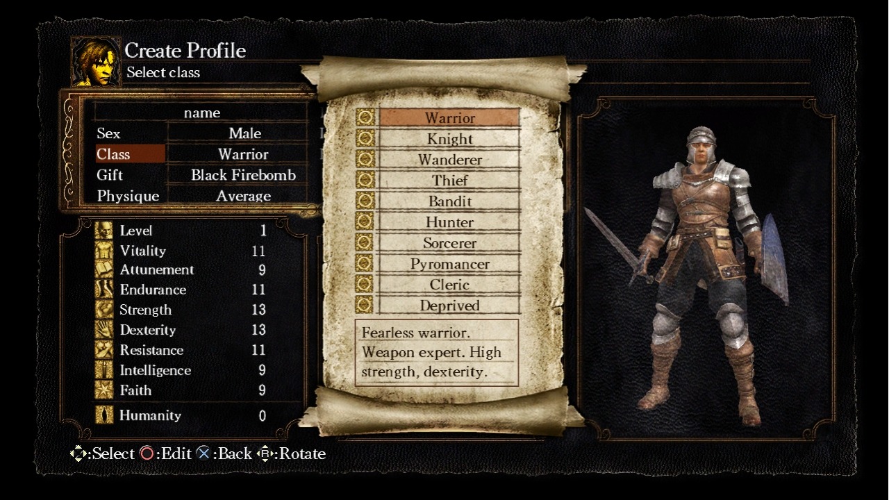 - volonté : nombre de sorts pouvant être mémorisés en même temps À ces caractéristiques s'ajoutent le niveau général du personnage (qui influence sa résistance aux attaques) et son niveau d'Humanité. Ce dernier permet entre autre d'augmenter la résistance aux malédictions, et surtout de renaître sous forme humaine (voir ci-dessous).
