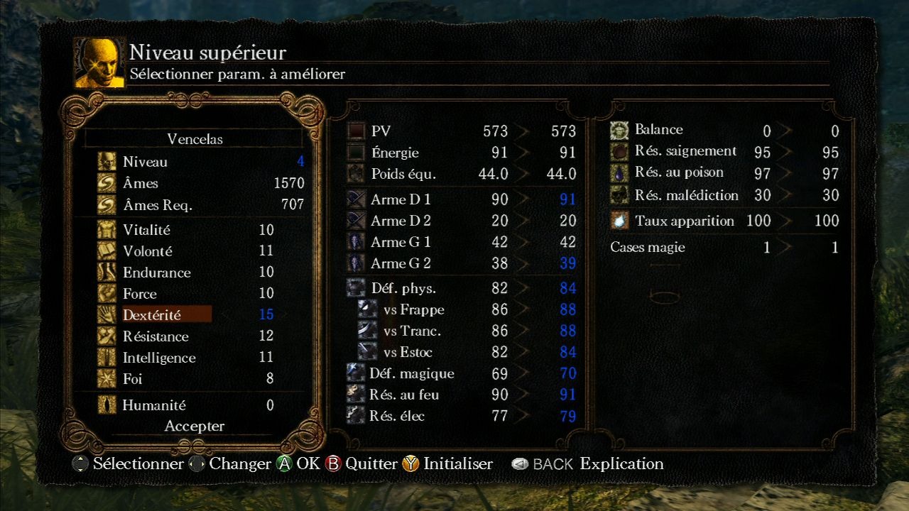 Évolution Tout au long du jeu, vous récoltez des âmes en vainquant des ennemis ou dans des coffres. En dépensant ensuite suffisamment d'âmes vous pouvez faire évoluer le niveau de votre personnage et améliorer ses caractéristiques. L'apprentissage de nouvelles compétences se fait indépendamment du niveau, en les achetant simplement avec des âmes auprès de marchands. Il est possible d'apprendre autant de sorts qu'on le désire, mais il faut ensuite les mémoriser (c'est-à-dire les équiper pour les utiliser en combat), et le nombre de sorts pouvant être mémorisés en même temps est limité par le niveau de Volonté.
