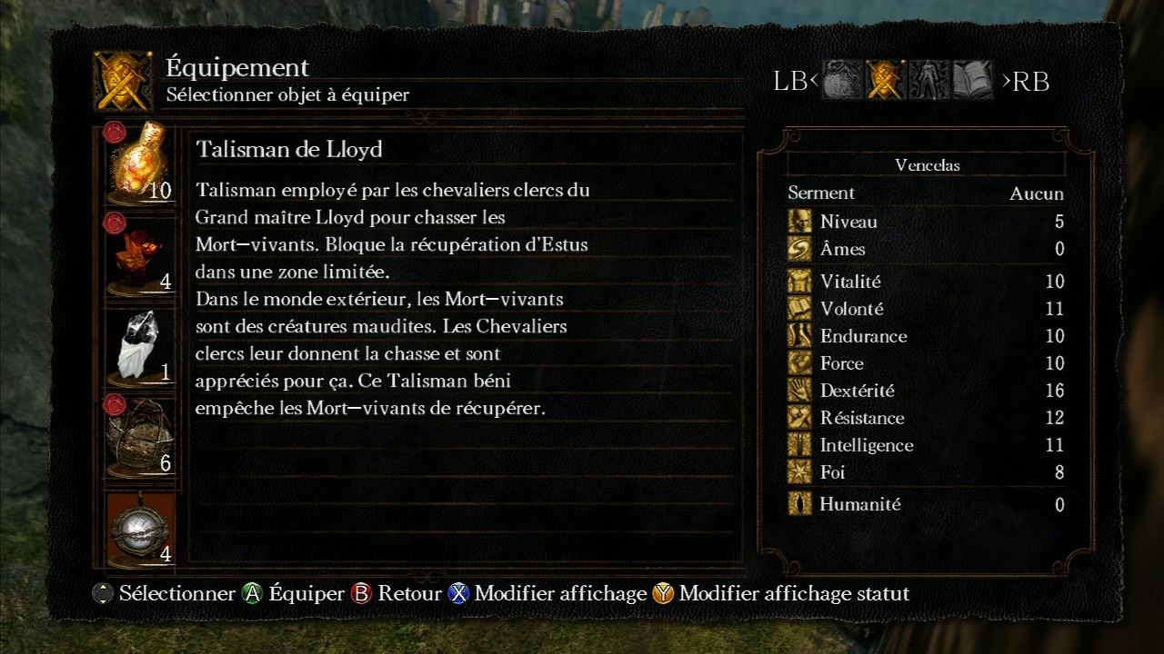 Sortez couverts... L'équipement de votre personnage est totalement libre et doit se faire par le menu principal. Vous pouvez choisir diverses pièces d'armures (parmi celles que vous possédez ou découvrez dans le jeu) pour couvrir tête, bras, torse et jambes, chacune apportant une certaine protection physique, magique ou nous protégeant contre diverses sources de dommages (poisons, feu, maladies...). Deux accessoires supplémentaires (anneaux) conférant différents bonus ou effets particuliers peuvent également être équipés. Enfin, en fonction de votre niveau de Volonté, vous aurez plus ou moins d'emplacements pour y associer des compétences (sorts, miracles ou pyromancie). Ces compétences s'utilisent ensuite en combat (de façon limitée) par l'intermédiaire de l'arme appropriée (baguette, talisman ou main de feu). Il est possible d'alterner entre les compétences par la touche « flèche haut ». À noter que l'équipement de compétences ne peut se faire qu'au niveau des feux de camp (contrairement au reste de l'équipement qui peut être changé n'importe quand).
