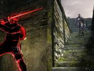 Vengeance !!! La dernière fonctionnalité online est un peu l'inverse de la précédente : elle consiste cette fois à envahir (sous forme de fantômes noirs) le monde d'autres joueurs, qui doivent être humains, pour les tuer. C'est méchant, c'est sadique, oui, mais qu'est-ce que c'est plaisant ! Il existe plusieurs méthodes pour envahir un monde : la plus générale consiste à se servir de fragments d'oeil rouge (à usage limité) pour tenter d'envahir un monde. La recherche d'un monde hôte se fait automatiquement, avec comme condition que le joueur envahi doit avoir un niveau proche du votre, et il ne peut pas y avoir plus de 2 fantômes noirs dans le même monde. D'autres méthodes peuvent être utilisées : laisser une marque d'invocation rouge (auquel cas le joueur hôte décide lui-même de se laisser envahir), utiliser un objet de guilde pour envahir le monde de joueurs répondant à certaines conditions, ou encore s'équiper d'un objet de guilde pour répondre à des convocations automatiques du chef de guilde et être envoyé dans d'autres mondes. Cette dernière méthode demeure la plus simple et est surtout illimitée !