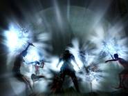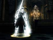 Un Chevalier servant La deuxième fonction très utile et très agréable consiste à aider ou obtenir l'aide d'autres joueurs en passant d'un monde à l'autre sous forme de fantôme. Pour aider d'autres joueurs, il suffit de laisser une marque d'invocation sur le sol. Lorsqu'un joueur a besoin de vous, il peut vous invoquer grâce à cette marque et vous vous matérialisez sous forme de fantôme blanc dans son monde. Inversement, vous pouvez également invoquer des fantômes d'autres joueurs dans votre monde en touchant leur signe d'invocation (il est possible de faire appel jusqu'à 2 fantômes en même temps). Les fantômes gagnent de l'expérience comme s'ils se battaient normalement, et peuvent rester dans le monde d'un autre joueur jusqu'à avoir atteint l'objectif de la zone (c'est-à-dire tuer le Boss du coin...), ou jusqu'à ce qu'ils soient tués. L'avantage étant qu'un fantôme blanc ne perd ni ses âmes ni son humanité s'il est vaincu, il retourne simplement dans son monde. Un autre aspect positif est le fait qu'un fantôme gagne 1 point d'humanité s'il aide à vaincre un boss.
