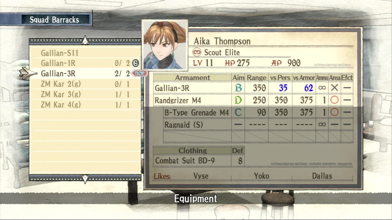 Si on commence le jeu avec uniquement des scouts, une fois dans les rangs de l’armée, on peut commencer à pourvoir sa petite unité personnelle. On peut recruter en tout 17 personnages, en excluant Alicia, Rosie et Largo qui jouent un rôle dans l’histoire et sont impérativement inclus dans l’équipe. Il faudra choisir les autres membres parmi un panel d’unité mis à disposition dans le QG et qui s’enrichira au fur et à mesure. Chaque membre potentiel possède des lacunes et des qualités ainsi que des compétences propres. Une unité se présente donc sous deux aspects.