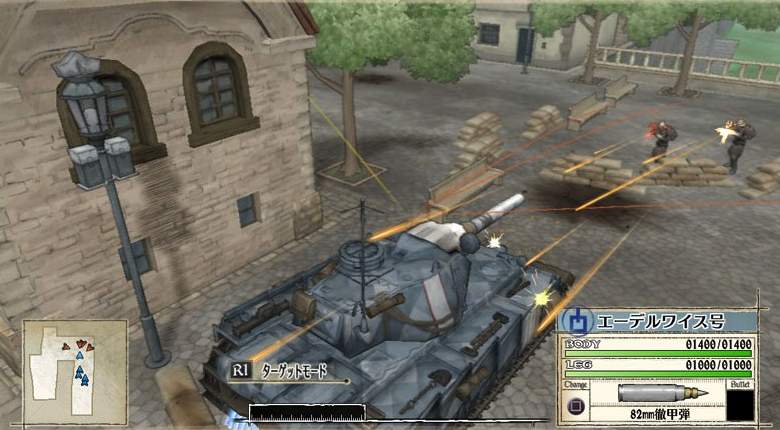 - Tank : Le tank est un peu différent des autres unités étant donné qu’il abrite Welkin, le leader et que sa défaite est synonyme de Game Over. Invincible face aux tirs ennemis, doté d’une tourelle meurtrière, autant en attaque qu’en défense, ainsi que d’un mortier et d’un canon, le tank peut faire des ravages dans les rangs ennemis et peut lutter contre les tanks adverses en l’absence d’un lancer. Il peut aussi servir de bouclier pour dissimuler les unités alliées en les protégeant de sa cuirasse. Toutefois, pour entrer en action, le tank consommera deux CP au lieu d’un. De plus, comme tous les tanks ennemis, un seul tir bien placé dans le radiateur arrière sera synonyme de destruction totale, ce talon d’Achille limite grandement certains de ses mouvements. Valkyria Profile