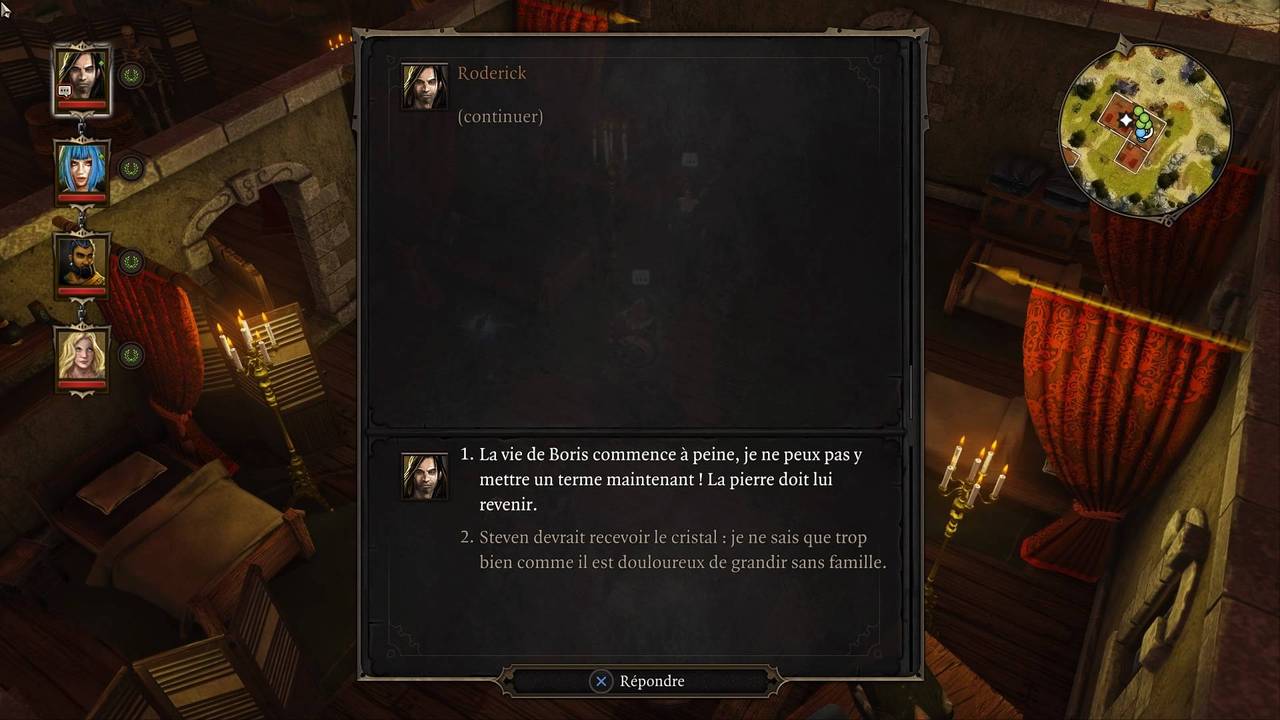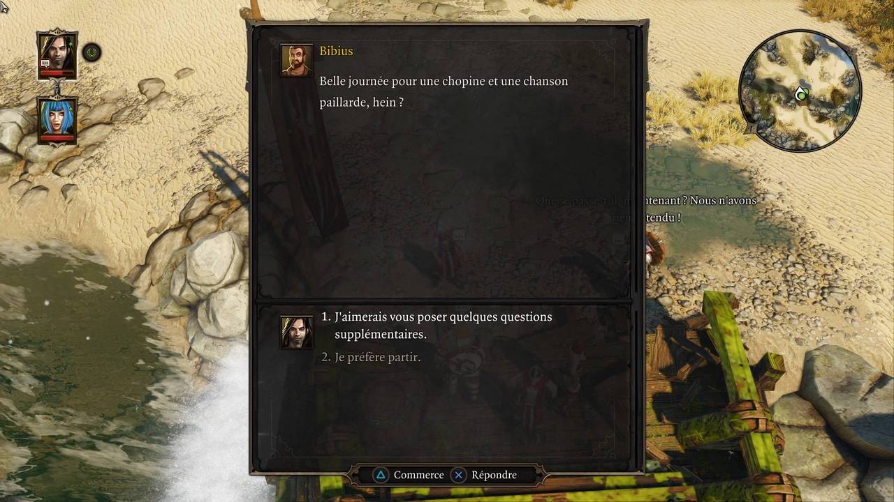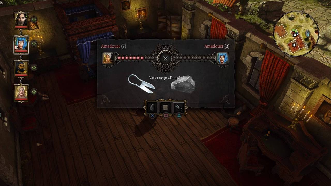 Un élément dont on n'a pas encore parlé jusque-là, et qui pourtant n'en est pas moins crucial dans Original Sin : le Pierre-Feuille-Ciseaux ! C'est selon ce principe que vous devrez, tout au long du jeu, convaincre les gens que les choix que vous faites sont les meilleurs. En effet, il arrive très souvent que vous deviez choisir entre plusieurs discours, en fonction de votre personnalité : choisir d'amadouer, intimider ou convaincre influencera votre caractère et la façon dont les autres vous perçoivent. Mais pas uniquement, car votre interlocuteur est celui que vous devez convaincre, et certains types de réponses fonctionneront mieux que d'autres sur chacun d'entre eux.