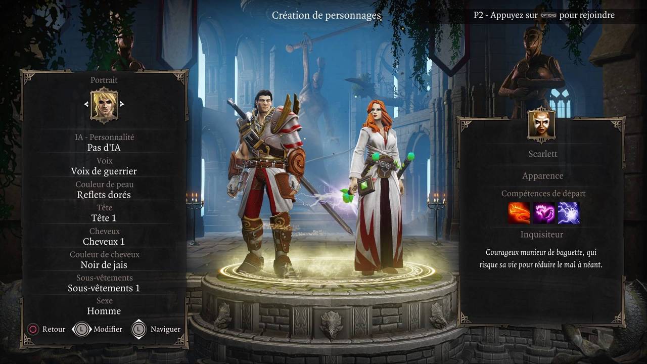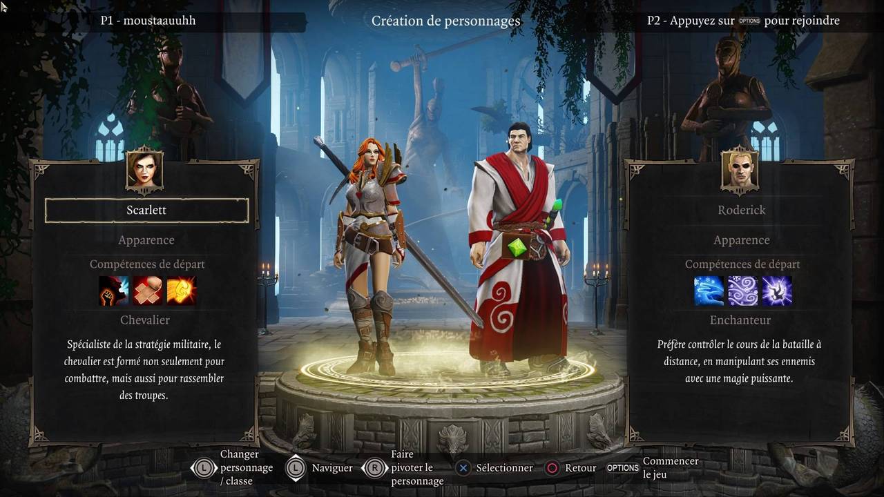 Les héros, qui sont au nombre de deux, sont créés de toutes pièces au lancement de la partie. On a le choix du genre de chaque personnage, de son apparence, sa classe, son caractère, et également son nom. Par défaut, nous avons une femme, Scarlett, et un homme, Roderick.
