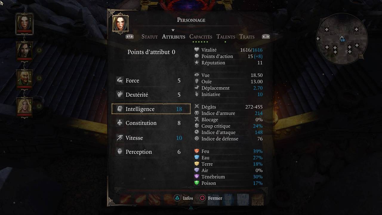 Toutes les informations et descriptions de chaque caractéristique, chaque capacité, sont accessibles d'une simple pression de la touche triangle dans la page de profil. On peut également connaître les détails et les effets de chaque statistique. Vous voulez comprendre pourquoi votre personnage a tant de PV ou de dégâts ? Passer le curseur dessus et afficher les détails indiquera exactement d'où il tire sa force.