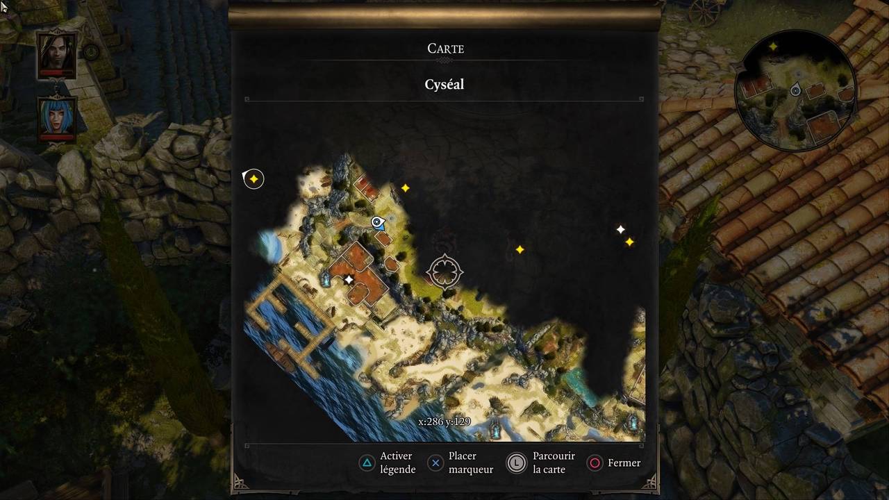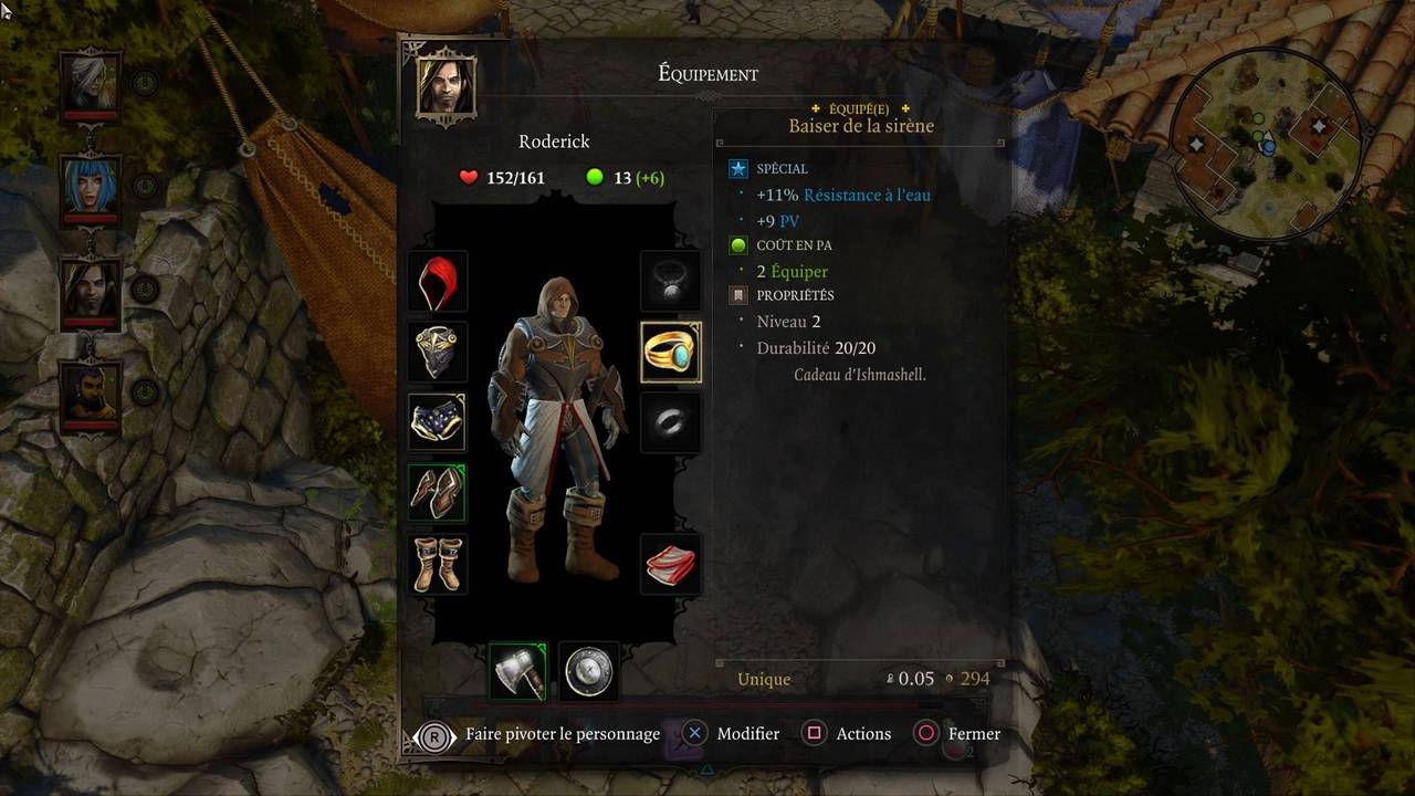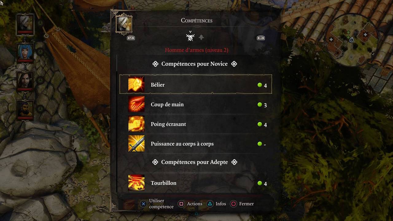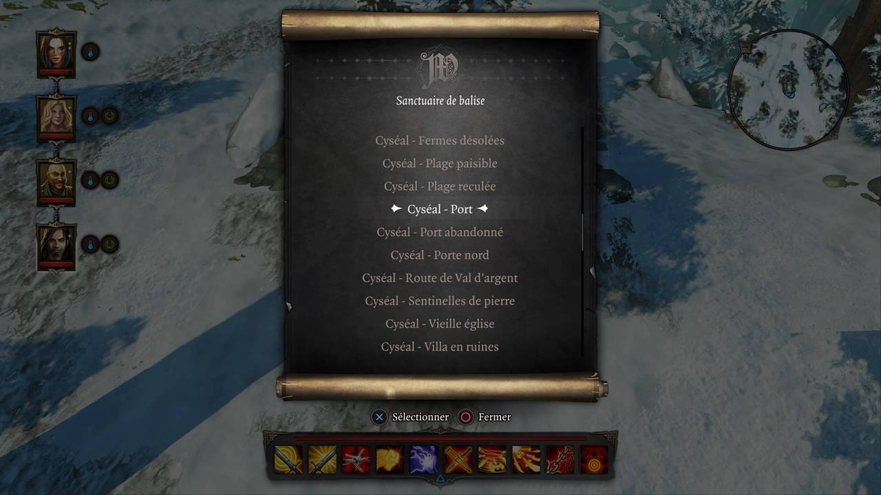 Les personnages sont interchangeables, et hors combat, on peut contrôler n'importe lequel. Maintenir la touche L2 permet d'afficher le menu des personnages, il suffit ensuite d'orienter le stick gauche dans la direction de celui dont on souhaite prendre le contrôle. Le fonctionnement est identique pour accéder aux différents menus (journal, inventaire, équipement, profil, fabrication et compétences) : maintenir R2 tout en orientant le stick gauche vers le menu souhaité.