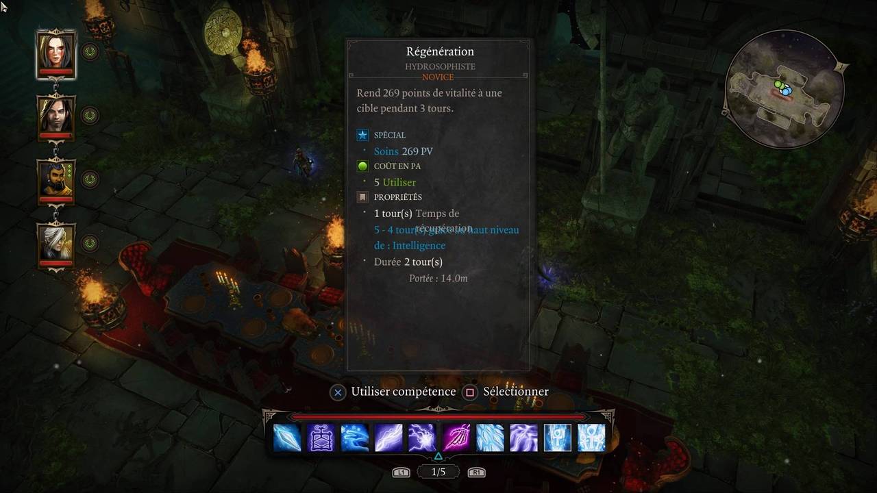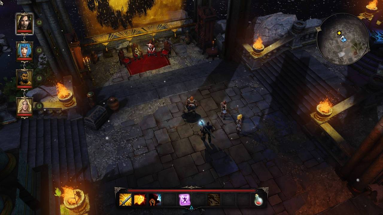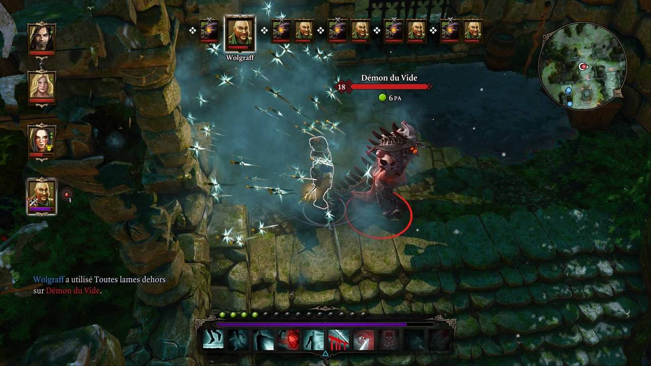 Les actions se font au fur et à mesure qu'on les sélectionne, et ne peuvent pas être annulées. La barre de compétence comprend cinq pages distinctes, permettant d'y insérer jusqu'à cinquante compétences ou objets consommables (parchemins de compétences, grenades, potions, flèches élémentaires, nourriture). On peut aussi utiliser un objet directement depuis l'inventaire sans l'ajouter aux raccourcis. Certaines compétences peuvent blesser les alliés (notamment celles avec une zone d'effet, comme les explosions). Notez également que toutes les compétences sont utilisables hors combat (utilisation limitée uniquement par le temps de recharge cette fois-ci), et l'on peut débuter un combat en attaquant une cible neutre ou à distance.