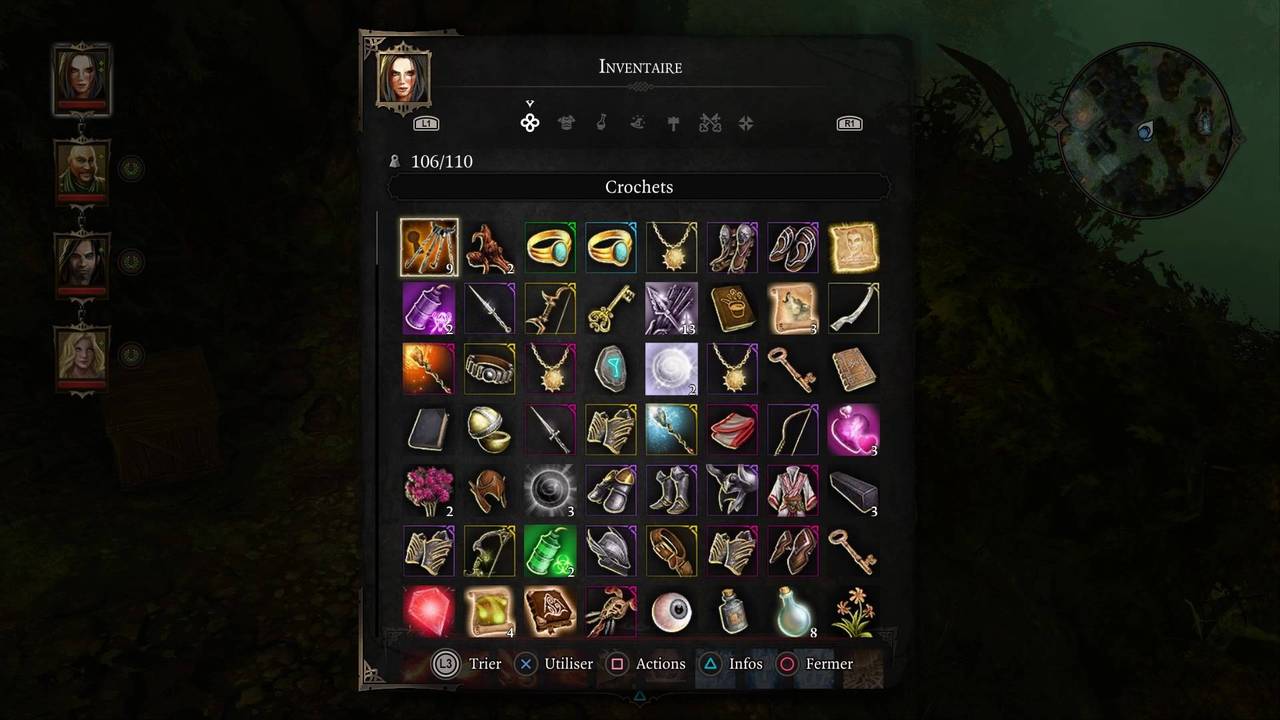 Chaque personnage possède son propre inventaire et ses propres menus (en dehors du journal de quête qui est commun), il faudra naviguer entre les personnages et les menus à chaque fois que l'on souhaitera modifier leur équipement. Les objets ramassés sont stockés dans l'inventaire de celui qui les collecte, dans une certaine limite de poids (dépendant de sa force). On peut facilement transférer un objet d'un inventaire à un autre, permettant ainsi de répartir les charges entre chaque personnage.