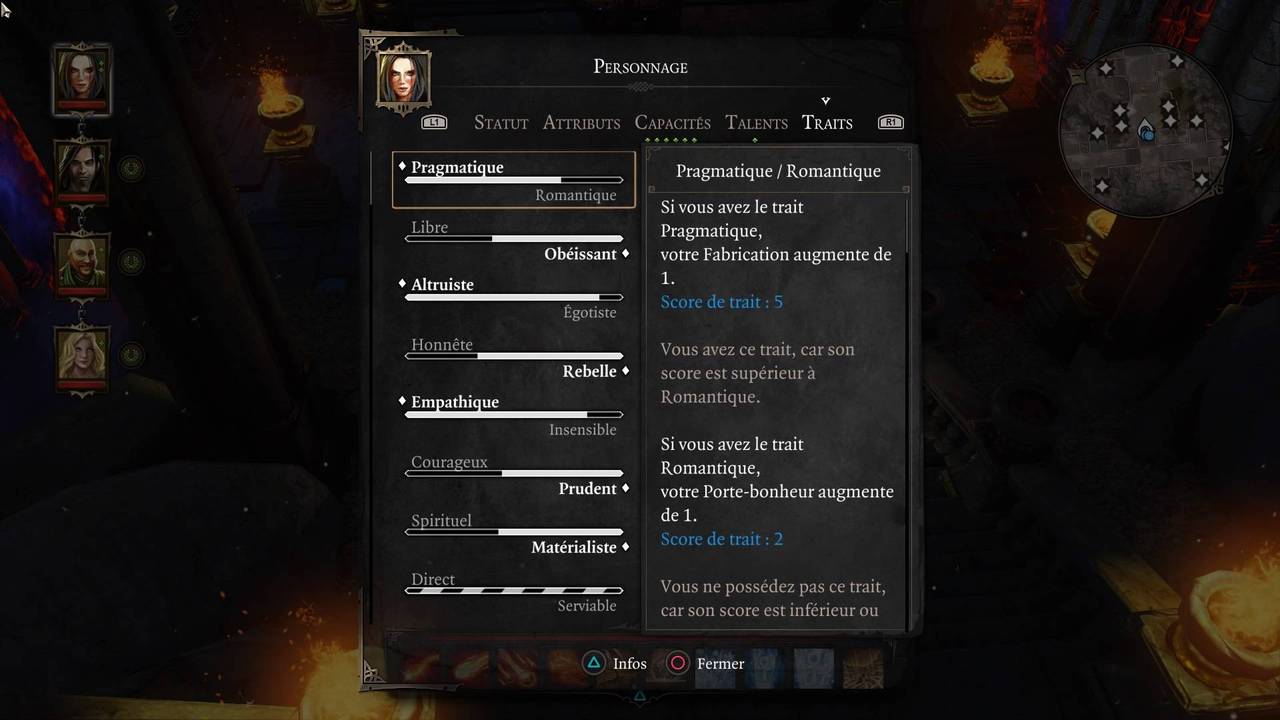 Enfin, les Traits déterminent le caractère du personnage, en fonction des différentes décisions prises au cours du jeu.