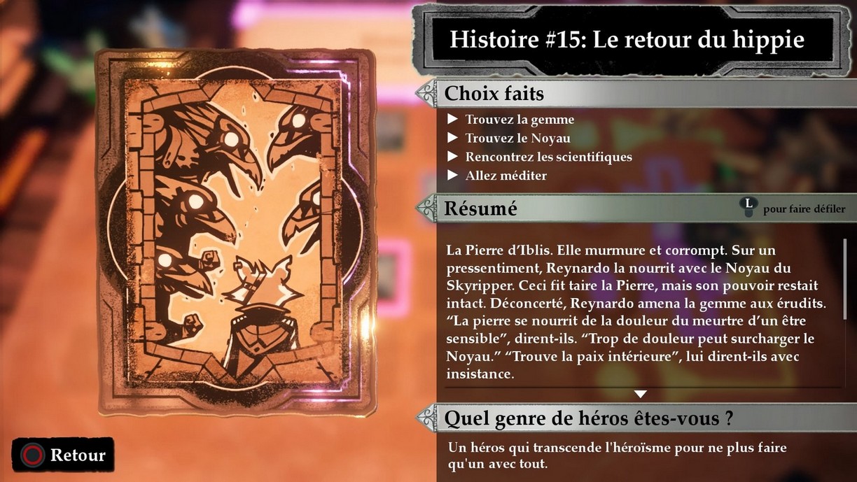 Nous en parlions au départ : une fois une histoire terminée, on retourne au début et on recommence à zéro. Enfin pas tout à fait : on reprend après le prologue, en conservant tout ce que l'on a débloqué auparavant : aptitudes, épées et gemmes. Et heureusement, car les combats se veulent de plus en plus difficiles. Au niveau de l'histoire en elle-même, certains choix qui n'étaient pas disponibles au tout début le sont désormais. Afin de nous aider à orienter nos choix en fonction des fins désirées, on trouve aussi des symboles sur les différentes possibilités : une serrure indique une « Vérité » non explorée, une clé indique le dénouement, un point d'exclamation indique une fin non débloquée. Mais ils ne sont pas là à chaque fois qu'un choix se présente. Il s'agit vraiment de nous orienter au départ pour ne pas trop se perdre dans les possibilités. Un code de couleurs indique également le type de choix, menant à tel ou tel type de fin.