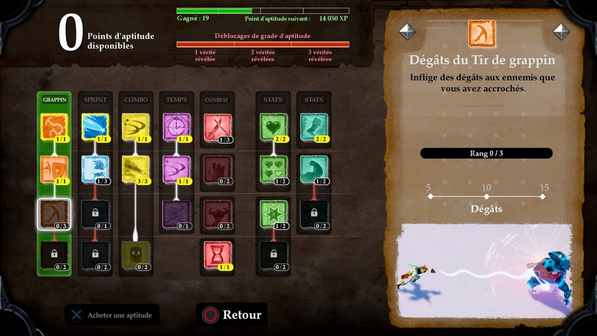 Celles-ci vous permettent d'améliorer vos caractéristiques, en augmentant par exemple de manière permanente votre maximum de points de vie, ajoutant une ou plusieurs jauge(s) d'endurance ou augmentant la vitesse de déplacement ; elles permettent également d'améliorer le grappin afin d'infliger des dégâts avec ou de sprinter (charger) à travers les adversaires, ou bien encore d'atteindre un adversaire de n'importe quelle distance et même de ralentir le temps après une action réussie.