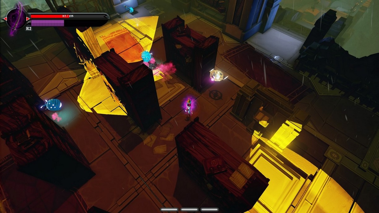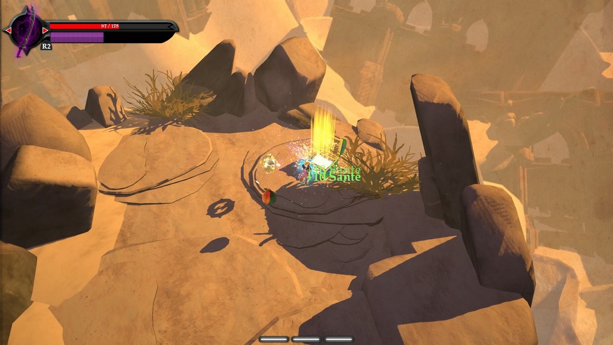 D'ailleurs, le seul moyen de recharger ces deux jauges est de trouver des items de soin dans les éléments destructibles de l'environnement (ce qui est assez rare, surtout en combat). Du coup, on préférera parfois se faire tuer au cours d'un combat pour repartir au dernier point de passage avec les jauges (vie et magie) remplies à moitié ; c'est encore la façon la plus rapide de se soigner...