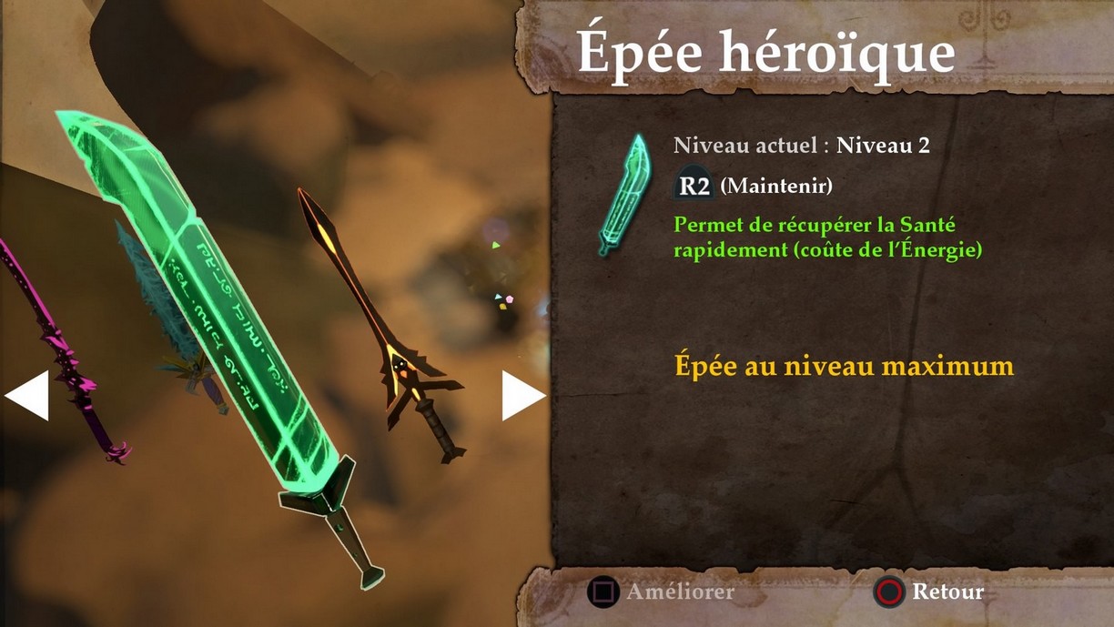 Parlons maintenant de la forge : elle permet de fabriquer de nouvelles épées et d'équiper des gemmes. En réalité, le principe lui-même est on ne peut plus simple ! Il y a quatre épées à forger ou améliorer, de propriétés différentes. Une fois fabriquées grâce aux matériaux trouvés dans les coffres, le personnage peut changer d'arme comme bon lui semble, même en plein combat.