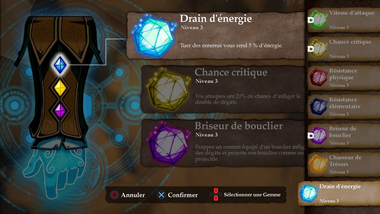 Le deuxième élément de la forge concerne les gemmes. Celles-ci permettent d'obtenir différents bonus : augmenter la vitesse d'attaque, la résistance physique ou élémentaire, les chances de coups critiques, ou d'obtenir un objet rare, ou encore permettre de détruire les boucliers en attaquant... Chaque gemme a trois niveaux d'amélioration, obtenir plusieurs fois la même augmentera simplement son niveau. On possède trois emplacements de gemmes dans le gantelet de Reynardo ; et on ne peut équiper deux fois la même. Évidemment, une fois acquise, la gemme est définitivement possédée et en changer dans l'équipement ne la fera pas disparaître.