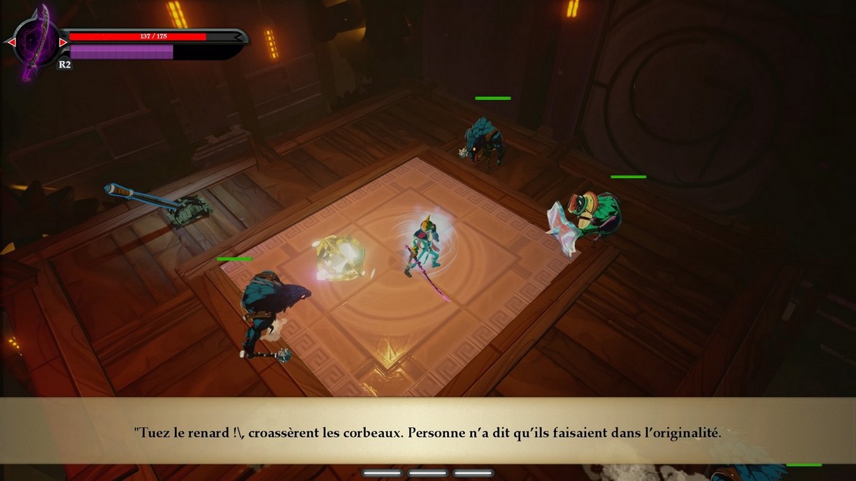 Nous avons parlé des combats mais qu'en est-il des boss ? Et bien, c'est simple : il n'y en a pas. Le jeu donne la part belle à la narration, ainsi, tout retournement de situation est conté plutôt que vécu. C'est un peu dommage quand certaines situations s'y prêtent, d'autant plus qu'à mesure que l'on débloque de nouvelles aptitudes, on aurait envie de montrer de quel bois on se chauffe à certains des personnages… mais non, il faudra vous contenter des quelques corbeaux à vous mettre sous la dent !