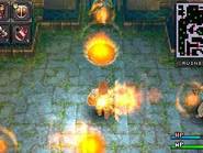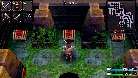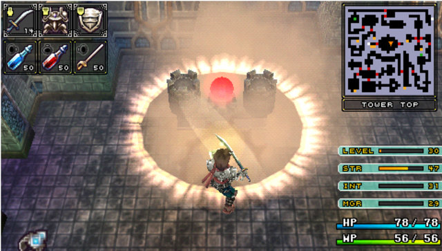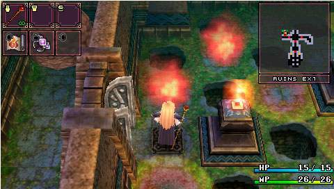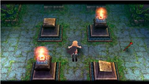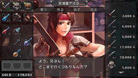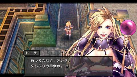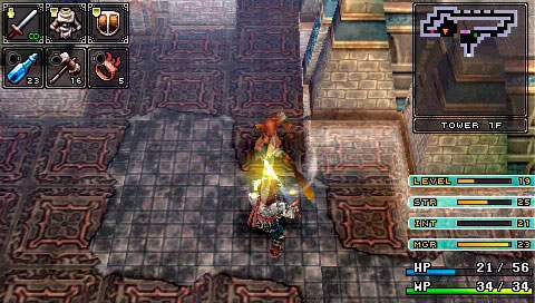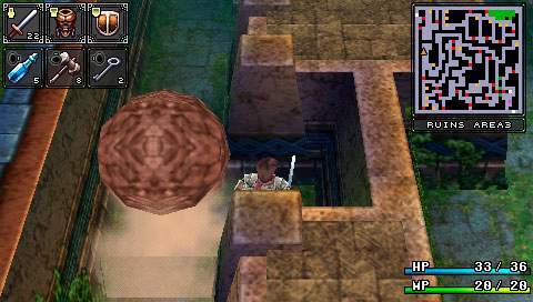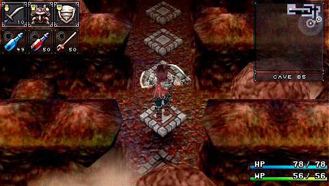 On sait tous que Falcom s’est prit d’affection pour la PSP. Sortant ainsi leur nouveaux titres voire même d’anciens titres sur cette petite machine. C’est ainsi au tour de Brandish, de se voir adapté en remake. Ce jeu, ou plutôt cette série, néanmoins pas très connue, nous fait un retour en force dans ce remake. Mais il est vrai que les avis sur ce jeu étaient plutôt mitigés. D’un côté on pouvait lire qu’il était énorme, et de l’autre qu’il était bien mauvais. Ce remake prouve bien à quel point ce jeu est excellent. Néanmoins ce n’est pas un type de RPG qui plaira à tout le monde, il faut le reconnaître… Un royaume déchu Il y a fort longtemps, un petit royaume du nom de Berimya fut construit autour d’une tour qui s’élevait jusqu’au ciel. Les habitants du royaume étaient protégés par le puissant dragon qui résidait au sommet de la tour, et ils vivaient donc tous en paix. Cependant un homme n’était pas satisfait. Il s’agissait du roi Berebus, qui avait soif de pouvoir et de conquête. Il voulait donc acquérir le pouvoir du dragon pour assouvir ses désirs. Il fit donc envoyer une armée dans la tour pour affronter le dragon. Le dragon ne résista pas et se laissa tuer par les hommes de Berebus. Néanmoins, Berebus qui avait acquis les pouvoirs du dragon, ne put contrôler cette puissance et en perdit le contrôle. Il était à présent maudit, et se transforma en monstre. Mais ce n’était pas fini, le royaume de Berimya ainsi que la gigantesque tour furent engloutis sous terre. Le scénario du jeu n’a donc rien d’exceptionnel, un royaume fantôme d’ou il va falloir s’échapper en ne croisant que vraiment peu de monde sur sa route. À se demander comment y en a qui peuvent avoir des boutiques dans ces lieux. Mais bon passons. Dans la plupart des scènes, on y verra Dela qui continue à poursuivre sans cesse Ares, malgré la situation dans laquelle ils se retrouvent tous les deux. Mais malheureusement pour elle, la pauvre magicienne se verra tout le temps tomber dans un piège lui faisant perdre sa proie et donnant des scènes plutôt marrantes. Pour le reste, oui, on croisera quelques NPC vous donnant parfois une petite tâche à accomplir pour avancer, voire des petites quêtes annexes. Nous aurons aussi le droit à quelques cinématiques de très bonne qualité, à chaque nouveau lieu, laissant place également à quelques explications. La cité perdue Brandish est donc un mix d’action RPG et de dungeon crawler. Le but étant de parcourir les différents étages de chaque lieu, trouver la sortie, et avancer, tout en évitant les tonnes des pièges et toutes sortes de bestioles. Bien sûr tout est en temps réel, donc même si vous voulez remettre votre inventaire en ordre, les monstres peuvent vous attaquer. Pour les déplacements c’est comme un D-RPG classique, on se déplace de case en case. Mais le petit truc de Brandish est qu’il faudra tout le temps tourner la caméra, ou la vue de votre personnage si vous préférez. Pour se tourner rien de plus facile, un petit coup sur les touches L ou R, ainsi il pourra voir et avancer en avant. Sinon il se contentera de faire des pas sur le côté et marcher en arrière. Ce système était assez délicat sur les anciennes versions où on pouvait ne plus s’y retrouver ou se donner mal à la tête tant les murs étaient hauts et ne laissaient aucune visibilité. Mais cela va beaucoup mieux dans ce remake avec une bonne 3D. L’aventure débutera donc par les ruines, puis on escaladera la tour pour arriver dans les caves. S’en suivra la Dark Zone (sans aucun doute l’endroit le plus dur du jeu) pour finir dans la forteresse. Sans trop s’attarder sur les monstres qui sont de toutes sortes, slime, chauve-souris, morts-vivants et même des humains, la forteresse contient en plus de cela, une partie des boss et mini boss du jeu, rien que ça. Mais parlons plutôt des pièges qui sont en grandes quantités. Tout d’abord les trous. Parfois ils sont déjà présents sur la carte ou alors se créeront sous vos pieds. Néanmoins il est parfois assez facile de les repérer si on regarde bien le sol. Il y a deux types de trous, ceux qui vont causer des dégâts et ceux qui vous renvoient à l’étage inférieur. Il y a aussi des flèches sortant des murs, des troncs qui sortent des murs pour vous pousser dans les trous, des piques, des rochers qui vous tue d’un coup net et aussi du poison posé sur le sol qui vous pompe les HP. Bref il y a énormément de pièges et certaines salles en sont truffées de tous les côtés. Dans ce jeu il ne faut pas vraiment avoir peur des ennemis mais véritablement du décor. Unbreakable Sword Comme cité plus haut, il y aura donc que rarement des NPC. Les seuls avec qui nous pourrons un peu dialoguer, ce sont les marchands. Au tout début du jeu, au premier étage des ruines donc, on trouvera trois marchands différents. Une boutique d’objets, de magies et d’équipements. Mais le choc lorsqu’on arrive par exemple à la boutique de magie, quand on voit un parchemin pour 120 000 golds ! Alors au début on se dit, ‘punaise mais c’est énorme’, car oui il faut savoir qu’aucun ennemi ne donne de l’argent. Notre seul moyen de s’en faire est d’en trouver dans les coffres ou de vendre les objets trouvés par terre. Car même les ennemis ne lâchent rien du tout, ou alors c’est très rare pour certains. Mais en plus de ça, on se rend compte que les armes ont une durée de vie et qu’elles peuvent donc se briser. Alors oui au début on peut paniquer sur le sujet. Au niveau des objets, un large choix s’offre à nous pour vite remplir notre inventaire (surtout ne pas oublier de réunir les objets pour gagner en place). Mis à part les potions pour regagner des HP et des MP, il y aura aussi une potion qui permet de se rendre invisible quelques secondes, une autre qui permet d’augmenter la durabilité d’une arme. Des objets du