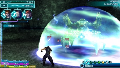A ce moment là, donc, le système de combat s’enclenche, affichant vos caractéristiques (HP, MP et AP) en bas à gauche et le menu d’action (Attaquer, Magie, Commande et Objet) en bas à droite. L’ensemble du combat se déroulera alors en temps réel, et il conviendra donc au joueur de définir ses actions le plus rapidement possible. Pour cela, les boutons L et R serviront à se déplacer dans le menu et X à lancer l’action. Tout se déroule toujours très rapidement et très peu de ralentissements seront à noter au cours de l’aventure. Un bon point, surtout quand on visualise les différents effets de magie disponibles… La touche carré permettra d’effectuer une roulade et d’éviter une attaque ennemie. Vous découvrirez très rapidement l’utilité de cette commande, vitale pour la plupart des combats, et en particulier les boss.