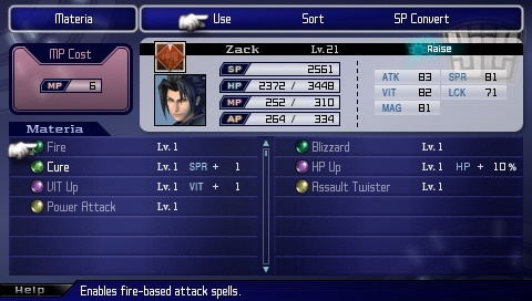 Mais ce n’est pas tout ! Après quelques aventures par ci par là dans l’univers du jeu, vous obtiendrez la capacité de pouvoir fusionner deux Materia ! Et là, nous rentrons dans un domaine très technique vous permettant au final de monter votre personnage à votre guise avec des capacités hallucinantes ! Un système bien pensé qu’il vous faudra expérimenter quelques temps, au prix de sacrifices importants !