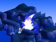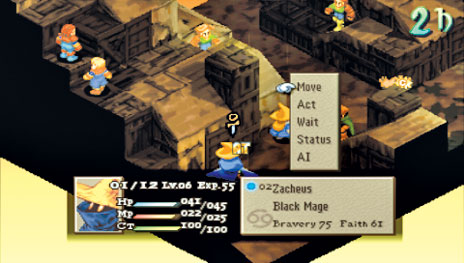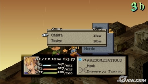 Au niveau du système de combat, chaque personnage agit suivant sa vitesse, le « thief » étant plus rapide qu'un « summoner », suivant un ATB qui est appelé temps de charge. Une fois prêt à agir, vous aurez la possibilité de vous déplacer et d'effectuer une action, suivant les compétences que vous aurez attribuées à vos unités. Si une unité perd tous ses HP, il est alors inconscient et un compteur de trois tours apparaît. Au bout de ces tours, il se transforme en cristal, que vous pourrez utiliser soit pour restaurer vos HP et MP, soit pour apprendre les compétences de la personne tombée au combat. Parfois, ce ne sera pas un cristal mais un coffre qui apparaîtra, offrant ainsi un objet à récupérer. Ce petit détail de jeu est important, car Ramza étant votre héros (un peu l'équivalent du Lord de Fire Emblem) s'il est battu, c'est game over. Cela dit, comme vous avez trois tours, vous pouvez le ranimer ou bien finir le combat et éviter ainsi de tout recommencer. Suivant le même principe, certaines attaques nécessitent un certain nombre de tours (qui correspond à une action d'un personnage) pour avoir un effet. C'est le cas notamment des magies et invocations. Sachez que, dans le cas de ces dernières, vous pouvez cibler une unité ou la case sur laquelle elle se trouve. Il faut donc prendre en compte ce délai, car vous risquez de manquer votre cible, pire, vous risquez de vous toucher vous-même. Par contre, le fait de pouvoir cibler précisément permet de lancer un sort et se retirer ensuite en sécurité. Il s'agit d'un détail qui force à bien penser sa stratégie.