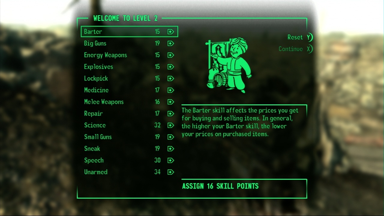Chaque compétence débute avec un certain nombre de points alloués qui dépendent des la répartition des caractéristiques établies auparavant. On peut également choisir trois spécialités parmi ces compétences ce qui permet d’augmenter celles que l’on préfère de 15 points en début de partie. Ensuite, on peut augmenter chaque compétence dès que l’on atteint un niveau supplémentaire. Le nombre de points alloués dépend du niveau d’Intelligence du personnage. On peut également augmenter une compétence (mais aussi ses caractéristiques) grâce à des objets et notamment en trouvant des livres ou les poupées représentant le Pip-boy, la mascotte du jeu. Créer prend du temps