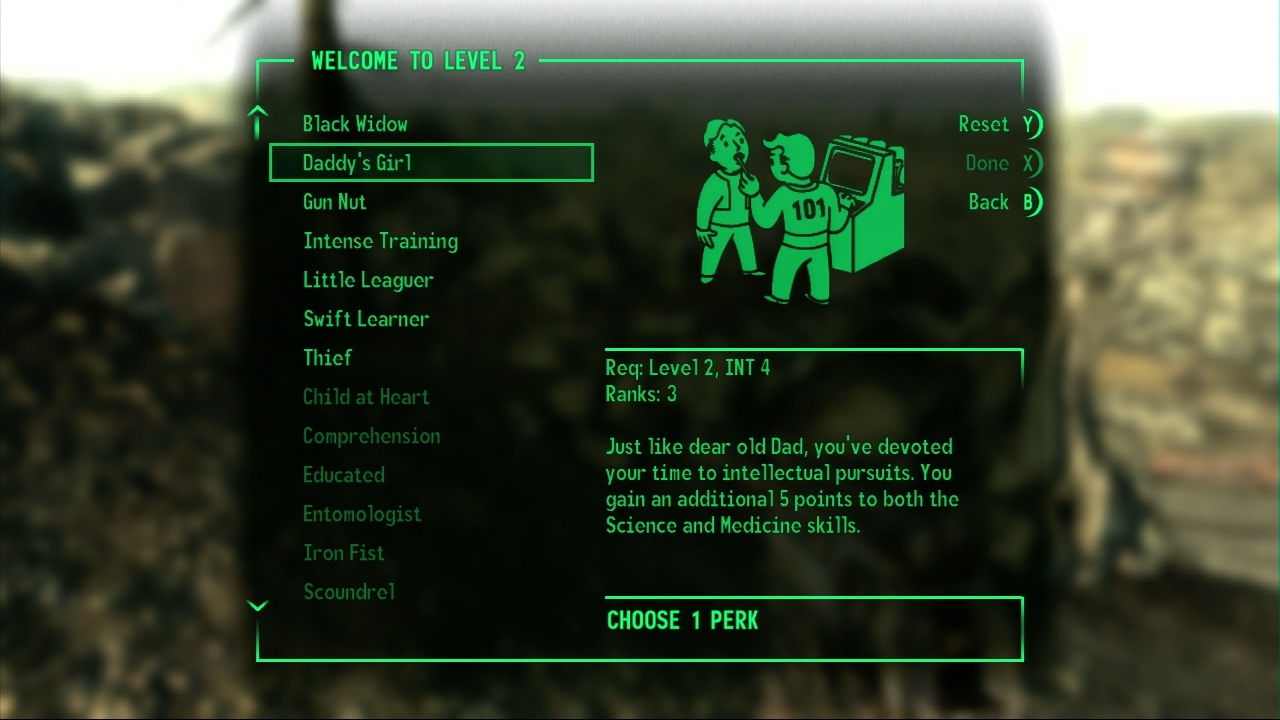 Pour ce faire, Fallout 3 propose des compétences aux joueurs qu’il pourra développer au fil des niveaux afin d’assurer sa survie et faciliter son exploration. Celles-ci sont moins nombreuses que dans les épisodes précédents et se jouent différemment aussi puisque Fallout 3 abandonne le système de tour par tour pour de l’action comme dans les Elder Scrolls enchaînant la vue à la 3ème et à la 1re personne. La première facilitant l’exploration tandis que l’autre facilite les combats qui se rapprochent d’un FPS. Toutefois, on reste bien dans un RPG et les compétences jouent un rôle primordial dans les combats et l’exploration, influençant grandement l’évolution du personnage. Ainsi, on trouve les compétences suivantes :