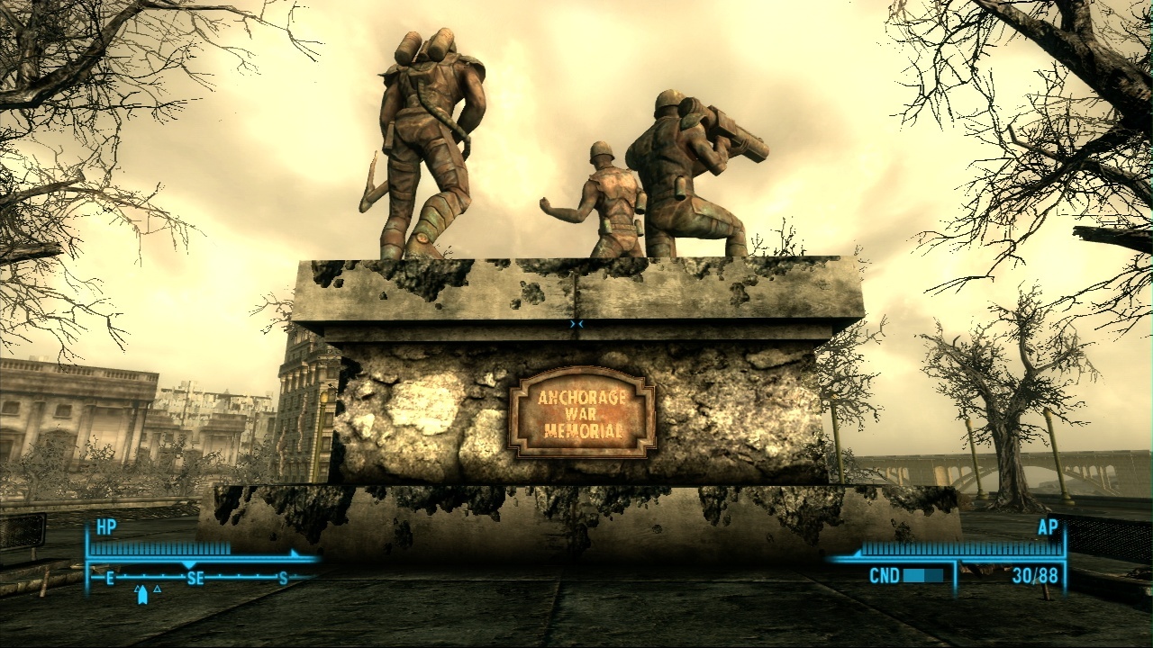 Fallout 3 fait donc partie de ces jeux qui parlent à ceux qui ont une âme d’explorateur. Et à ce niveau-là, il est pleinement réussi même si l’idée de voyager dans des plaines calcinées n’a, à priori, rien de plaisant. Pourtant, pris entre un jeu de lumière superbement géré, qui nous indique l’évolution des heures, et un champ de vision très large permettant de distinguer à des kilomètres de vieilles tours abandonnées ou autres bâtisses, on peut finir aisément par se plaire dans cette exploration grandiose et contemplative. Seules les limites imposées par le jeu viennent rappeler que le monde entier n’est pas à notre disposition. Il est d’ailleurs dommage que tout ne soit pas plus vaste, d’autres jeux du même acabit ayant proposé plus de zones à explorer sur des machines de générations précédentes. On peut également regretter que les villages extérieurs, à quelques exceptions près qui se comptent sur les doigts d’une main, ne regroupent même pas une dizaine de personnes. Le terme Terres Désolées prenant alors tout son sens.