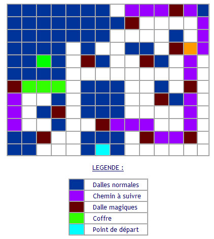 Vous voici dans la région de la neige. Cette partie de la map n'étant pas grande, il n'y a rien à visiter avant de continuer le scénario. Rendez vous donc au petit village : Imil. Commencez pas le rituel tour du hameau pour trouver les objets cachés. La maison en face de l'entrée contient une bouteille vide dans un coffre : prenez le, c'est un objet important dans la suite des évènements. Dans le magasin d'armes, un somnifère est caché dans le baril à gauche de la pièce. comme les vendeurs sont malades, vous ne pouvez acheter d'équipements pour l'instant. Il y a 9 pièces d'or dans une jarre, à coté de la maison la plus a gauche du village. Allez à l'auberge pour vous restaurer. Il y a un Djinn ici. Pour l'attraper, il suffit de bouger le bonhome de neige sur la gauche et de slalomer entre les petits piliers de manière à atteindre la grotte au nord. Il viendra tout seul, pas besoin de le combatre. De même pour le coffre en haut, une fiole, il faut utiliser le bonhomme de neige pour faire un parcourt afin d'arriver en face de l'échelle. Allez maintenant au temple en bas du village. Parlez à la petite fille qui vous dit que Sophia est dans la première maison. Vous imaginez ce que vous devez maintenant faire. Allez y et vous trouvez Sophia soignant le grand père. Tout à coup, elle part en direction du "Phare". Suivez la. Allez sur la map puis au Phare plus haut. Vous retrouverez Sophia, soucieuse. Elle ne peut continuer avec le bloc de pierre qui gene le passage. Utilisez donc votre psynergie déplacer. Vous découvrez qu'elle aussi est une mystique, gardienne de quelque chose. Etonnée, elle continu sa route. Suivez la. Un monstre lui bloque le passage, et en bon héros que vous êtes, tuez le. Elle s'en va de nouveau. Continuez votre route pour la trouver encore une fois. Une statue lui bloquant de nouveau le passage, utilisez comme précédement votre psynergie. Impressionée, elle décide de rejoindre votre groupe. Continuez votre chemin ( en jettant un coup d'oeil au Djinn acquit avec Sophia et à ses psynergies ) Vous atteindrez alors une salle avec des tuyaux : il va falloir les bouger pour passer ( Notez qu'ici, il n'y a pas de combat ). Le premier qui gêne, poussez le simplement vers la droite, descendez sous les tuyaux par les escaliers et laissez vous entrainer par le jet d'eau. Refaite la même opération avec le second jet et faite le tour du troisième. Redescendez par les prochaines marches et continuez vers le haut. Un coffre est visible mais il faudra attendre pour l'ouvrir. Prenez le long escalier pour revenir vers le début de l'écran et pousser le tuyaux qui vous barrez le passage à l'allé. Les jets d'eaux disparaissent : il ne vous reste plus qu'à aller chercher le coffre qui contient un crystal psy, qui a le pouvoir de restaurez vos points de psynergie. Les jets ne gênants plus, vous pouvez passer sur le coté gauche en bas de l'écran. Une salle s'offre a vous. Sur la gauche, une trop grande creuvasse vous bloque le passage, allez donc a droite. Ne descendez pas l'echelle mais faite le tour par le bas pour arriver devant une statue à bouger. Comme vous le voyez, il faut la déplacer à gauche, sur le socle : la porte s'ouvre. Descendez sur la pente en face et passez la porte. Une foiq encore, prenez la pente pour tomber. Vous vous retrouvez dedant une statue. Après le message, sautez sur la divinitée et utilisez prière mineure, la Psynergie de Sofia : la statue se met a briller. revenez sur le plot : vous pouvez marcher sur l'eau trois fois ! Sautez sur un des cotés de la statues puis entrez dans la porte de droite. Montez sur le plot qui vous donnera trois saut sur l'eau. Atteignez l'autre rive en faisant escale sur le deuxième plot puis en prenant le passage, vous sortez d'une cascade. Le coffre à droite est un leurre, il renferme un mimic. Conbatez le ou laissez le. Attention tout de même il est assez fort et à près de 470 points de vie. Il laisse derriere lui une eau de jouvence. Entrez maintenant dans la cascade de droite. Ici, vous devez sautez sur les plot pour atteindre l'autre coté. rien de bien difficile mais il faut passer sur le deuxième avant d'arriver en face. Pour ce faire, passez par le nord puis a droite. sautez ensuite sur la rive. Le coffre contient une armure Psy. Revenez sur vos pas jusqu'au hall avec les deux passages en bas et allez en haut. Voici un autre petit casse tête. Il va falloir faire du saute-mouton de dalles en dalles. Notez que si vous tombez dans l'eau, vous revenez à votre dernière dalle magique passée. Voici un plan de toutes les dalles de la salle. suivez depuis le point de départ pour ne rien manquer. ![]() Quand le chemin ( couleur violette ) est trop long, c'est parce qu'il faut recharger le pouvoir sur une dalle magique la plus proche. Il n'y a qu'une fois où c'est le cas et la où il faut s'arrêter est symboliser par la couleur orange. Notez aussi que si vous voulez prendre le coffre ( somnifère ), il vous faudra refaire le chemin pour aller en bas ( le chemin du coffre est en couleur verte ). Une fois que vous avez atteint le coté gauche en bas, empruntez le passage. Continuez vers le bas sans vous soucier de la dalle magique qui vous sert d'appuis. Devant les cascades, prenez celle du millieu. Continuez en haut pour arriver devant des tuyaux : il faut réactiver l'eau dans la salle précédente pour activer les dalle et ainsi passer de l'autre coté. Allez complétement en haut et poussez le tuyau à l'horizontale. Poussez maintenant celui du millieu et en dernier celui du bas qui est à la verticale. Une fois l'eau remise, revenez dans la salle et utilisez les dalles magiques pour passer et emprunter les escalier. Vous aboutissez dans une salle où une porte est fermée au nord. Si vous allez sur l'interupteur au sol, vous ouvrez la porte mais si vous bougez, elle se referme. Prenez donc les escaliers sur la droite. Vous voyez une statue : il faut la faire descendre à l'