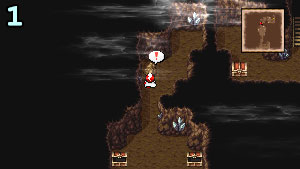 Avant de commencer, vous devez choisir les noms de vos quatre héros. Vous pouvez utiliser l’outil de “Suggestion” de noms si vous manquez d'idées, car ils n’ont pas de noms officiels. Après une scène d’introduction, vous devrez combattre trois gobelins, ce qui ne posera aucune difficulté. Une fois que vous pouvez bouger votre personnage, avancez vers le haut de l’écran pour découvrir deux premiers coffres : Bouclier de cuir et Potion. Examinez le rocher un peu plus loin afin de libérer le passage (image 1). Prenez le coffre sur la droite (Bouclier de cuir), et montez les marches. Emparez-vous du coffre sur la gauche (Vent antarctique) et sur la droite (Potion). Suivez le chemin en haut pour trouver un nouveau coffre (Potion). Allez sur la droite afin de trouver une source (image 2). Examinez-la pour restaurer entièrement vos personnages. Le coffre contient quant à lui Vent antarctique. Profitez de cet endroit pour faire passer vos personnages au moins au niveau 3 avant de poursuivre. Une fois prêt, montez les marches sur la gauche, et réalisez une sauvegarde rapide avant d’examiner le cristal. BOSS : GEOKHELONE