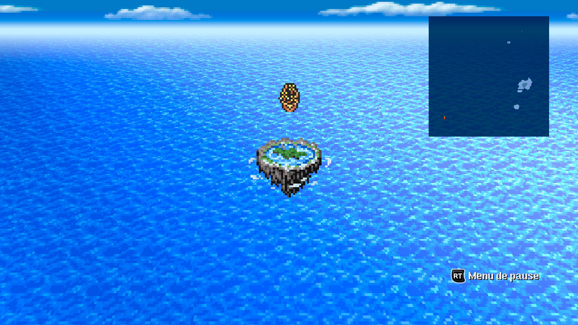 Une fois dans votre navire, appuyez sur la touche A pour vous envoler. A noter que vous ne pouvez atterrir que dans l’eau. Prenez tout simplement la direction d’un bord de la carte pour aboutir sur une nouvelle carte du monde : vous vous apercevrez que le monde est presque totalement sous les flots (image 28). Vous verrez plusieurs éléments de décors qui suggèrent qu'il existe un monde sous toute cette eau (image 30). Dirigez votre vaisseau au nord-est, jusqu’à une petite île contre laquelle se trouve un bateau échoué. Posez-vous ici et entrez dans le bateau.