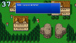 Approchez-vous de l’arbre sur la gauche afin d’y trouver une Carapace de tortue (image 37). Passez dans les arbres en haut à gauche pour atteindre l’herbe, qui contient deux objets : Carapace de tortue et Elixir. Faites de même sur le côté droit (Queue de phénix). Vous pouvez entrer par l’arrière de la maison en haut à droite, puis passez à l’intérieur par un passage secret en examinant la torche de droite pour atteindre le coffre contenant un Elixir. Vous pouvez également trouver un magasin qui vend des invocations, si vous utilisez le Conjureur. Parlez à tout le monde dans le village, et ressortez. Reprenez votre vaisseau et faites halte sur la petite île située entre les deux grands continents. Un petit village vous y attend.