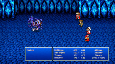 Il n’y a aucun coffre dans ce lieu, ni aucun objet. Le chemin est très linéaire, contentez-vous de suivre la route. Les monstres de ce lieu sont assez puissants, donc profitez de l’occasion pour prendre quelques niveaux. Vous arriverez finalement dans la salle du Cristal de l’eau. Guérissez bien vos personnages, sauvegardez et avancez. BOSS : KRAKEN