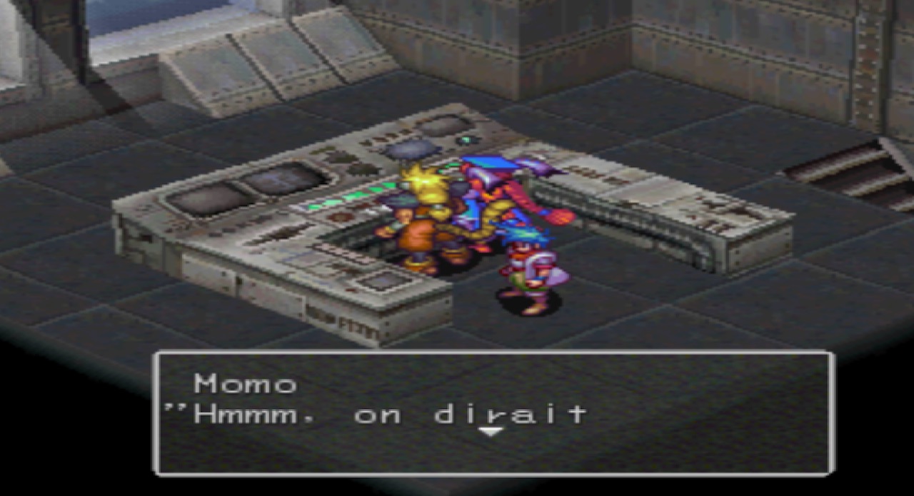 miniatureRetournez maintenant à Villordur et parlez à Beyd qui se trouve tout en bas de la ville. Sortez de la ville et dirigez-vous à l'ouest pour trouver le pêcheur solitaire. Dans sa cabane, vous trouverez le gène ??? (Image 1) ainsi qu’un oeil Hiro. Retournez au bassin pour reparler à Beyd. Prenez Momo dans votre groupe et parlez avec Beyd. Elle vous remettra une liste de pièces manquantes : 16 au total. Sortez du bateau et retournez à Villordur. Allez voir le Maître de la Guilde. Choisissez Garr comme équipier. Parlez au chef et il vous permettra de vous rendre sur la Plage Dacier, à l'ouest de Villordur. Allez à droite pour découvrir le gène Mutant. Avec Garr, parlez au gros bonhomme accompagné d'un singe tenant des drapeaux. Suivez ses instructions pour découvrir :