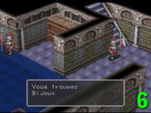 Rendez-vous au château et parlez au garde. Après le banquet, vous contrôlerez Nina. Fouillez sa commode (120 Zenny) et descendez les marches. Fouillez les armoires de la grande salle pour trouver deux Bijoux (Image 6) et un Médicam tout à gauche).