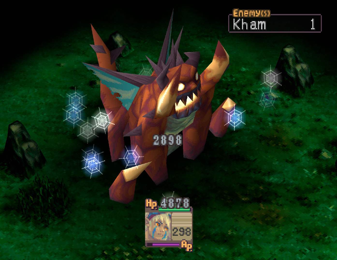 BOSS 1 : KHAM HP : 16.000 Coups : Flaming Fist / Mystic Fire EXP : 16.000 Zenny : 0 Trésor : Ambrosia Contre ce premier ennemi, rien de plus simple : utilisez la magie “Meditate” de Fou-Lu afin de vous transformer en dragon Astral. Utilisez ensuite le sort “Frost Strike”. Le combat devrait ainsi être plié en 3 ou 4 tours.