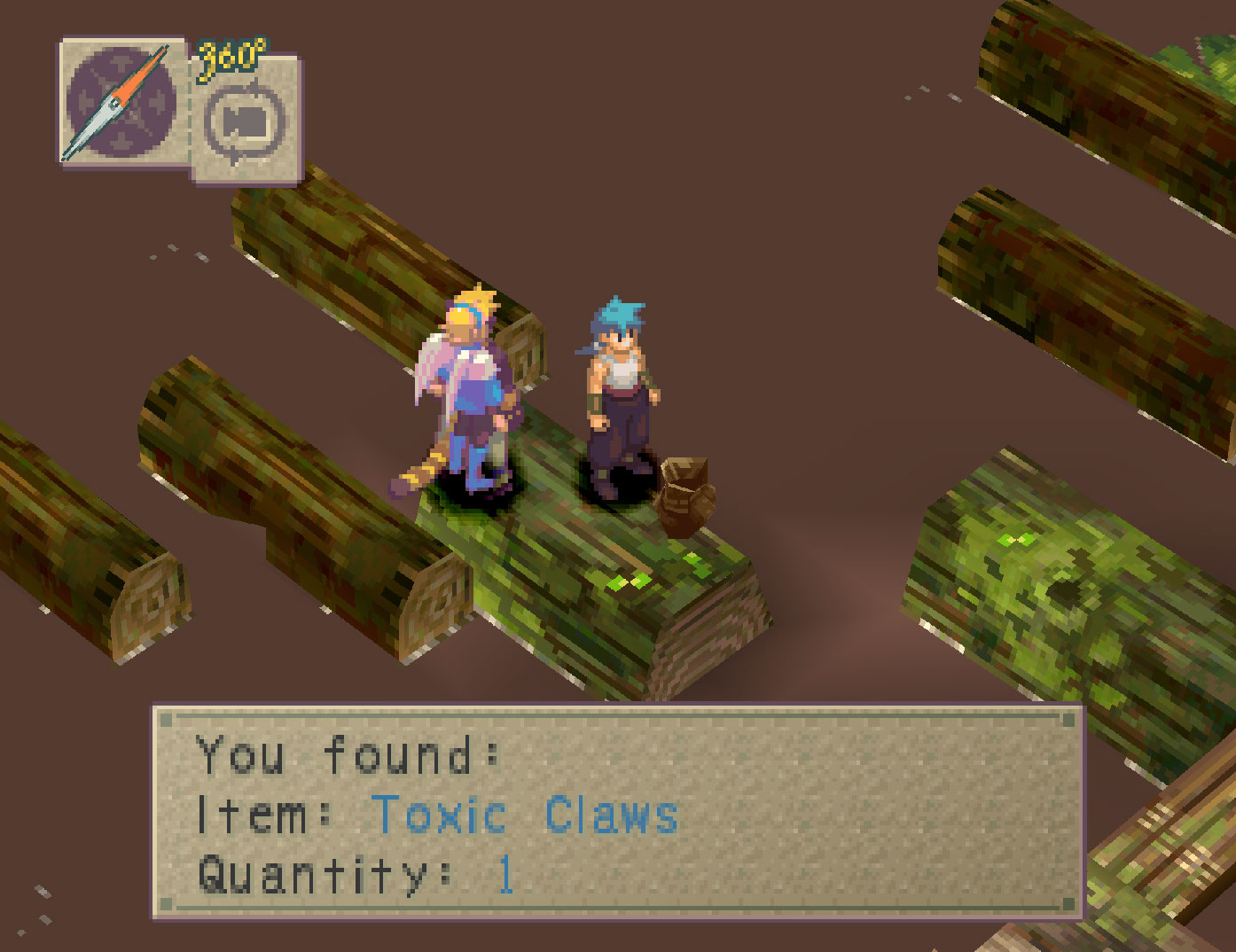 Suivez le chemin tout en restant sur la planche, jusqu’à un arbre. Allez alors vers l’est, puis sautez au nord et faites le tour de l’arbre et marchant dans la vase afin d’ouvrir le coffre, qui contient SuperVitamin. Montez l’échelle et traversez le pont suspendu afin d’atteindre la sortie de l’écran au nord-ouest. Dans la nouvelle zone, avancez jusqu’à une intersection. Prenez alors au sud pour trouver Aurum x2 dans un coffre. Revenez et suivez l’autre route jusqu’à sortir du côté ouest. Vous aboutirez devant de nouveaux troncs d’arbre à faire rouler sur l’eau. Placez-vous sur le premier rondin, allez au nord, puis avancez le second rondin pour l’aligner avec le suivant. Allez sur le troisième rondin et faites-le rouler vers le sud jusqu’à vous aligner avec un autre rondin. Allez sur ce dernier, puis roulez au sud afin de vous aligner avec le dernier rondin. Allez ensuite vers le nord en roulant sur différents troncs afin de récupérer le petit sac contenant Toxic Claws. Revenez et dirigez-vous vers l’ouest pour sortir du lieu.