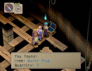 Sachez que vous pouvez retourner au bateau de Zig à n’importe quel moment en parlant au marin. A noter également que le monstre Krabby n’apparaît que dans la première zone, près du bateau. Une fois sur la rive, pénétrez dans l’épave par le biais du trou dans la coque. Le petit feu-follet au-dessus de votre tête vous éclaire et indique le danger, par exemple si vous approchez d’une planche qui va se briser. Engagez-vous sur la planche située à l’est, puis aux intersections allez successivement à l’ouest, à l’ouest, au nord, à l’est, au nord, à l'est, au sud et enfin vers l’est pour prendre le coffre : Burnt Plug x3. Du coffre, partez vers le nord jusqu'à la seconde des deux planches allant vers l'est. Allez dessus, puis au nord, puis à l’ouest jusqu’à une intersection en forme de croix. Continuez à l’ouest jusqu’à passer de l’autre côté du pilier. Prenez ensuite au sud, à l’ouest, au sud, encore au sud, à l’ouest, puis au nord jusqu'à un coffre avec Ring of Fire. Revenez sur vos pas (par le même chemin bien entendu) jusqu’à revenir près du pilier central. Allez au vers le nord, tournez à l’est, puis au nord pour atteindre une échelle. Vous vous retrouverez sur le pont du navire. Dirigez-vous vers l’avant du bateau pour changer d’écran et trouver un nouveau coffre contenant 1.500 zenny. Revenez dans l’écran précédent et engagez-vous sur le chemin à semi-visible. Suivez-le jusqu’à un coffre qui contient Panacea x2. Finalement, avancez vers l’est, puis au nord pour trouver l’entrée d’une grotte. BOSS 15 : GLEBE