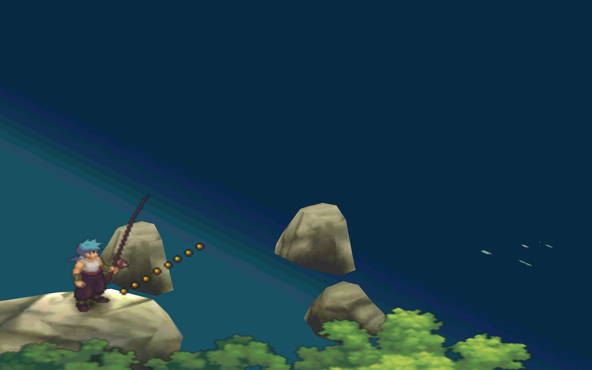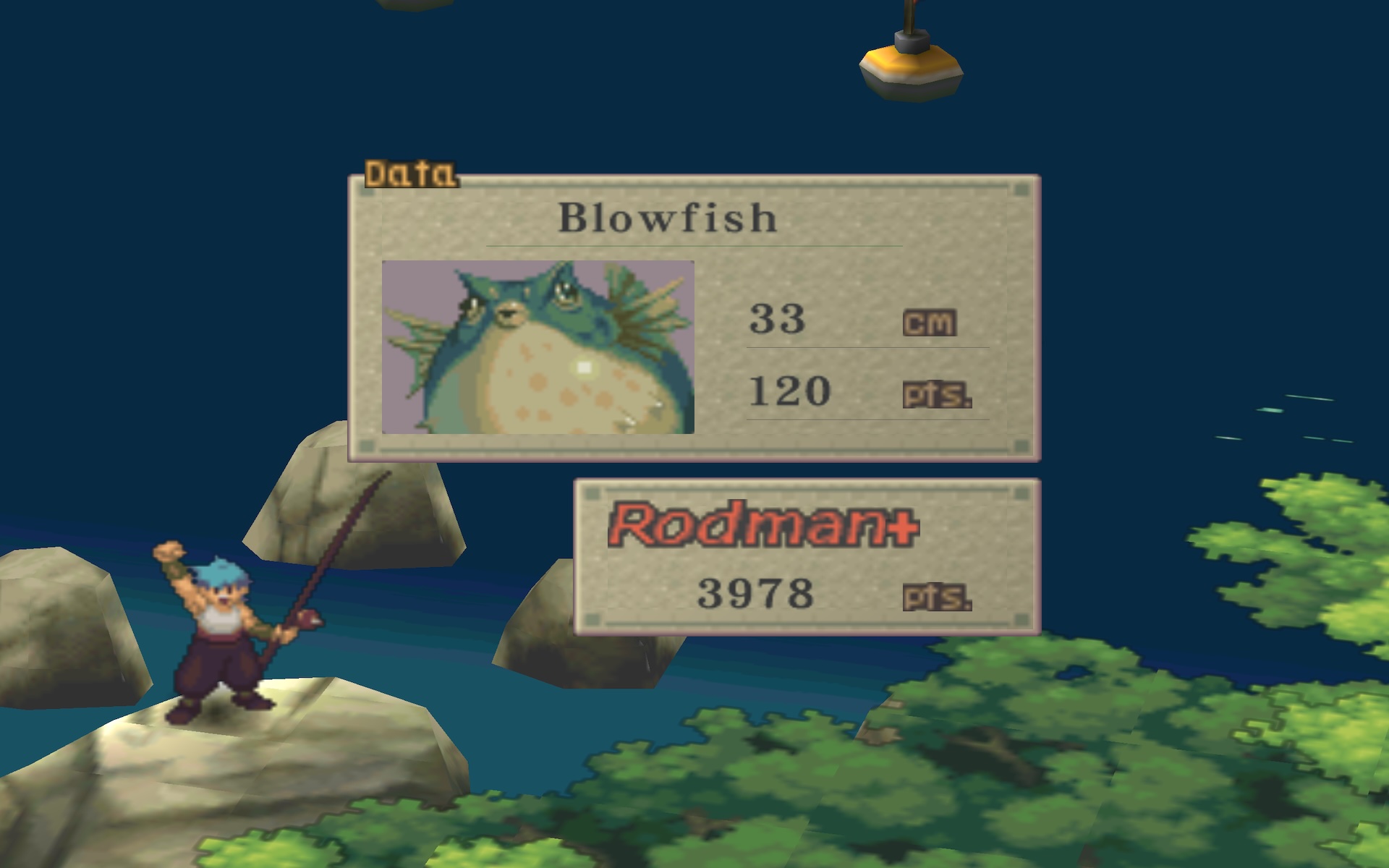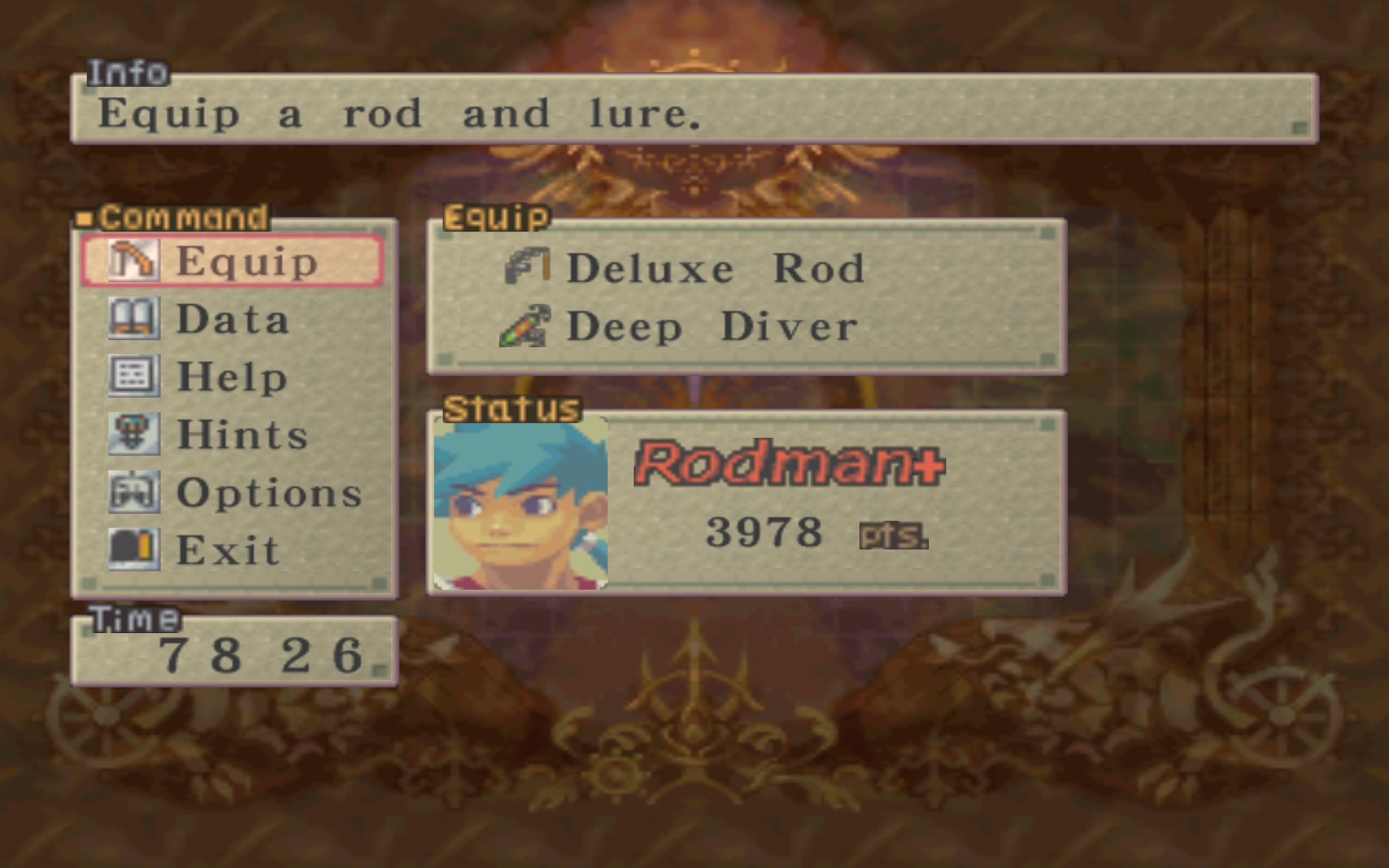 Les points de pêche sont affichés sur la fenêtre de statut des personnages (sauf Ryu), ainsi que dans le menu de pêche où vous verrez également votre rang de pêcheur. Le rang en lui-même n'a pas grande importance. Ce sont les points de pêche qui vont importer. En effet, les points de pêche servent à débloquer un maître (Gyosil) ainsi qu'obtenir ses récompenses. Pour cela, il vous faudra au minimum 3000 points au départ, et jusqu'à 9500 points au total, soit obtenir la quasi totalité des points de pêches du jeu. 3. L'équipement de pêcheAvant de pouvoir pêcher, accédez au menu de pêche et équipez-vous d'une canne et d'un appât parmi ceux en votre possession. Certaines permettent de ramener le poisson plus facilement que d'autres. Lorsque vous en possédez plusieurs, essayez les différentes cannes pour savoir laquelle vous préférez. Cela dit, plus leur niveau est élevé, et plus elles sont équilibrées et donc plus il est facile d'attraper les poissons les plus rares. Il existe 7 types d'appâts. Certains coulent quand ils restent immobiles, et remontent à la surface en bougeant. Certains restent à la surface, ou bien coulent en bougeant.