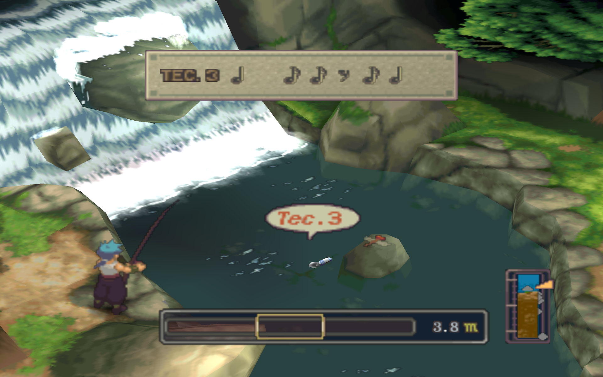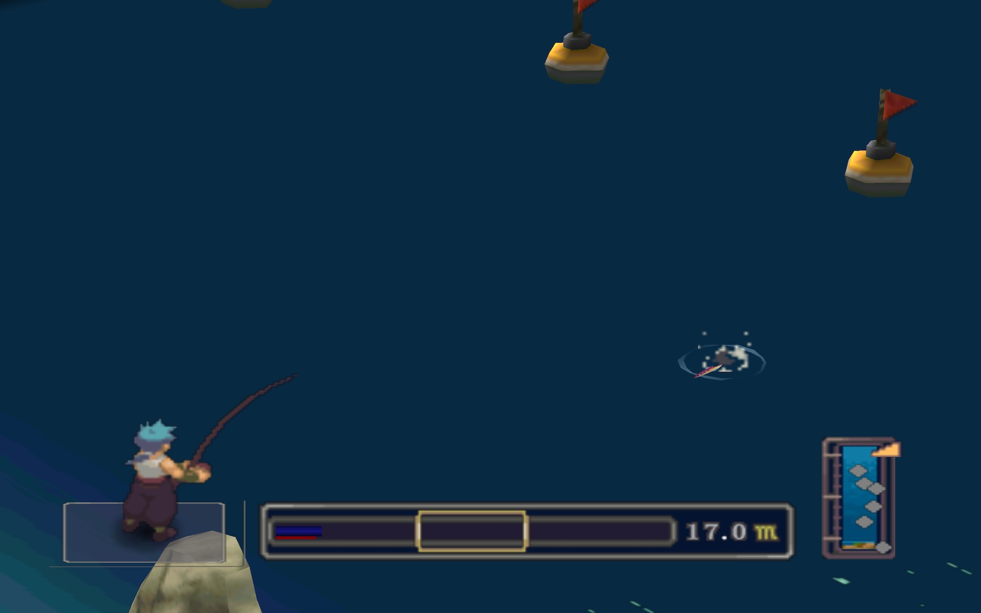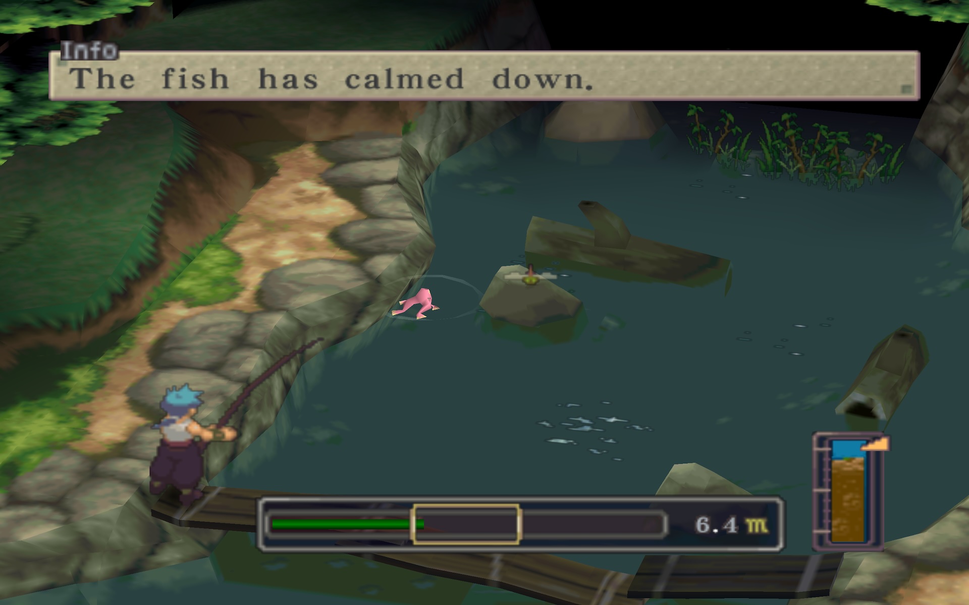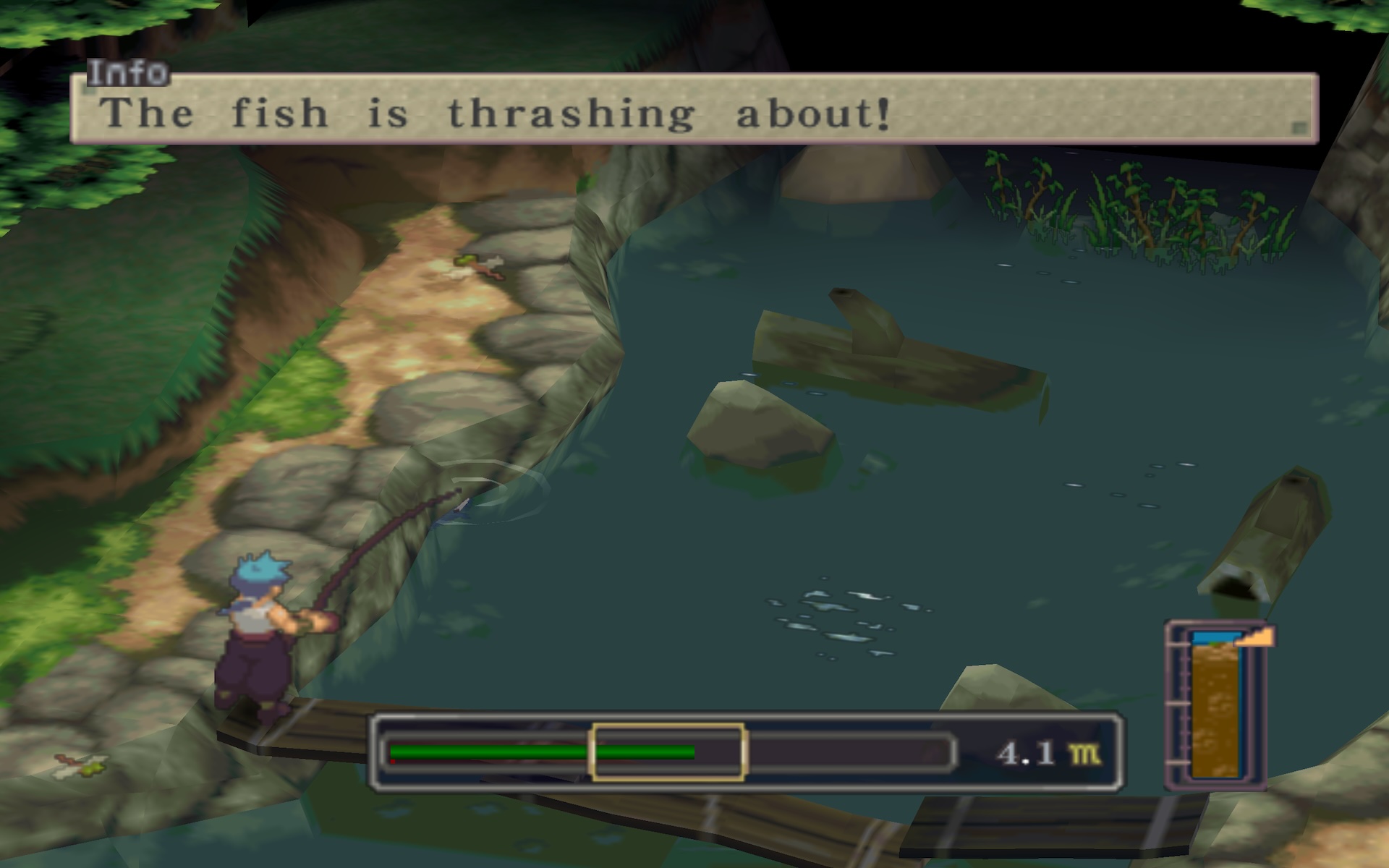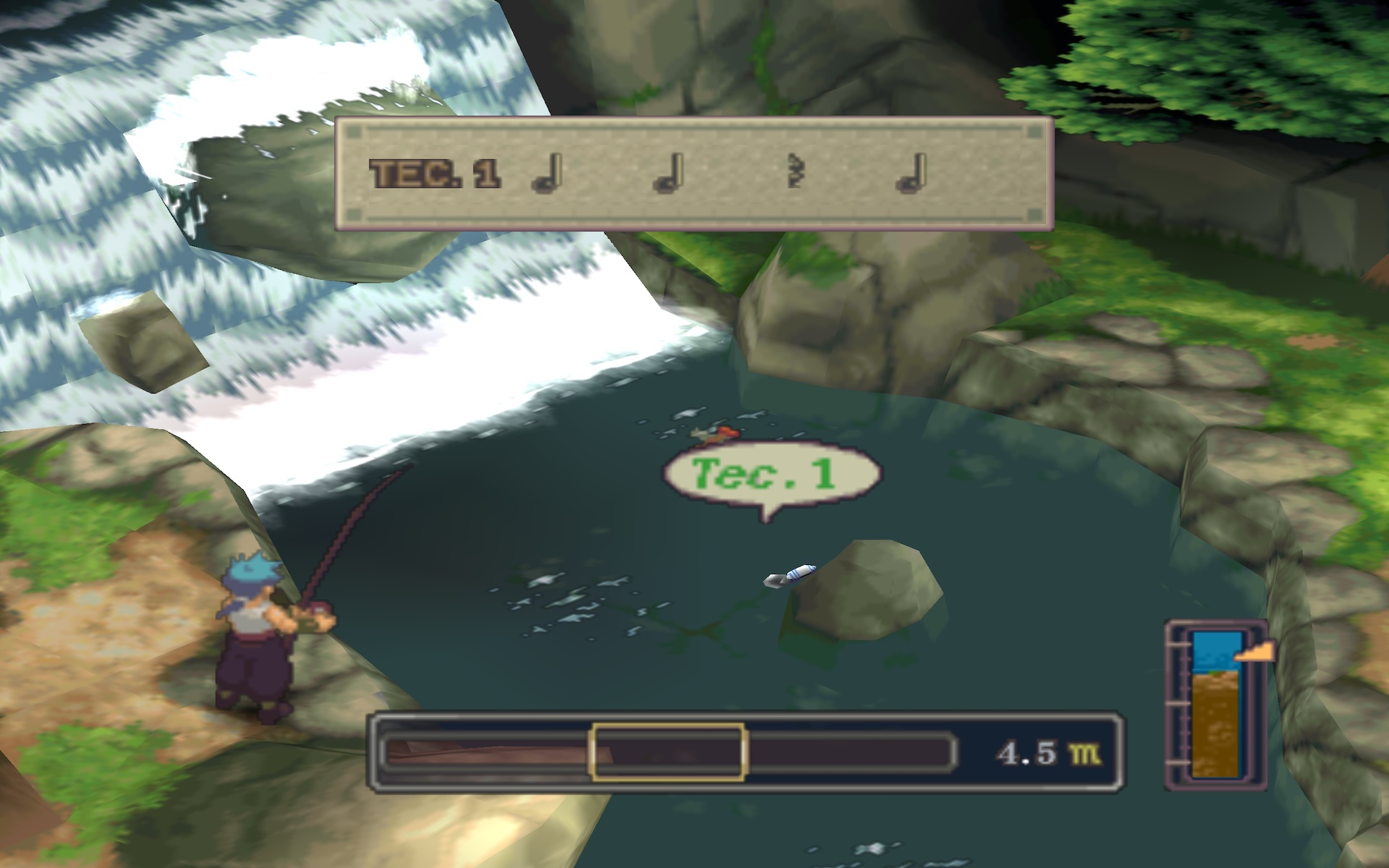 6. Ferrer le poissonL'étape la plus courte mais la plus délicate. Lorsque vous sentez une légère vibration, que l'eau fait des remous et que la jauge verte de la canne s'active, appuyez une fois sur X ou déplacez l'appât et le poisson mordra à l'hameçon.