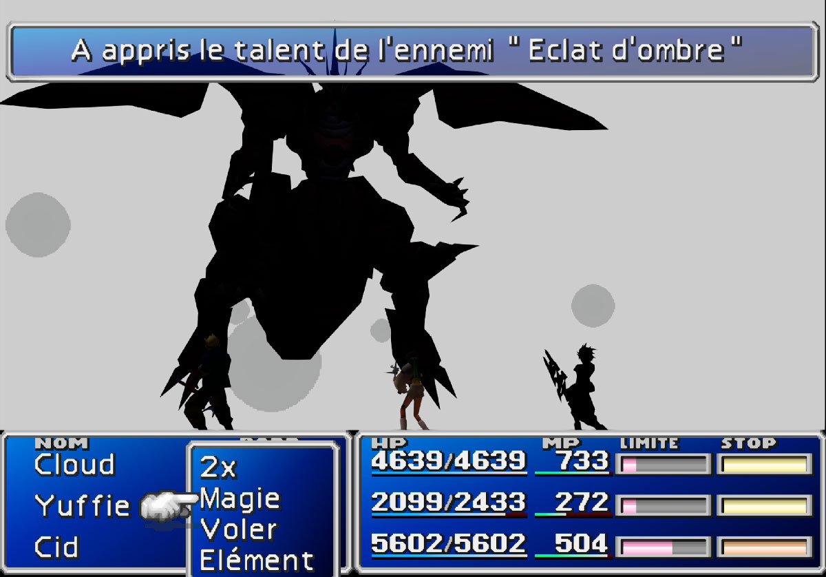 HP : 20.000 / MP : 400 EXP : 35.000 / AP : 3.500 / Gils : 25.000 Niveau : 61 Objet reçu : Dernière arme Compétences : Dernier rayon / Eclat d’ombre C’est un ennemi très puissant, que vous allez devoir attaquer à la magie ou à l’aide d’attaques de longue portée. Les magies de la Materia Contenir, le Souffle magie, Ultima ou les dernières invocations sur très puissantes et fonctionnent très bien. Sachez qu’il lancera Eclat d’ombre, l’une des plus puissantes magie du jeu et un Talent de l’ennemi, sur le personnage qui lui portera le dernier coup. Mieux vaut vous prémunir de cette attaque à l’aide d’un Reflet, et vous apprendrez malgré tout le Talent de l’ennemi de cette façon. A présent, si vous avez fait la quête du Battle Square au Gold Saucer, vous pourrez obtenir la Materia Attaque finale en faisant une dernière série d’affrontements, via le “Combat spécial”. A noter que lors de sa destruction, la Dernière Arme à créer un chemin vous permettant d'accéder à la Forêt Ancienne, si vous n’avez pas de Chocobo d’or.